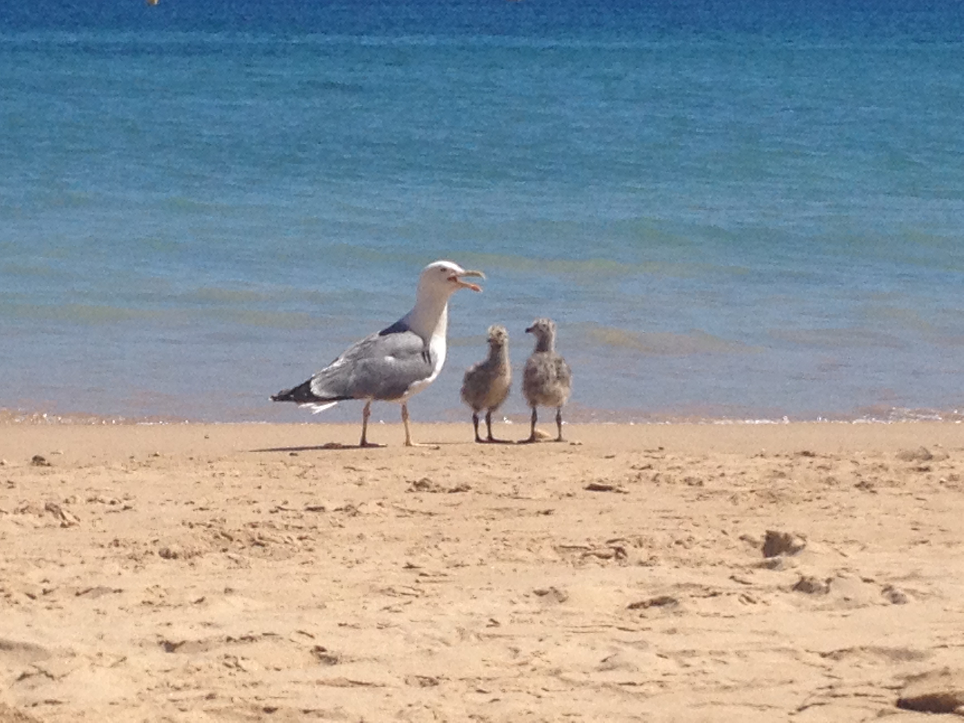 Isot lokit pelottavasti hyökkäilivät sellaisten ihmisten kimppuun, jotka menivät poikasia liian lähelle. Jotkut ihmiset juoksivat karkuun, toiset yrittivät hätyytellä poikasia kauemmaksi, me makasimme mahoillamme ja jossain vaiheessa jo peitimme päämme pyyhkeillä, jottei lokkiarmeija luulisi meitä vihollisiksi.