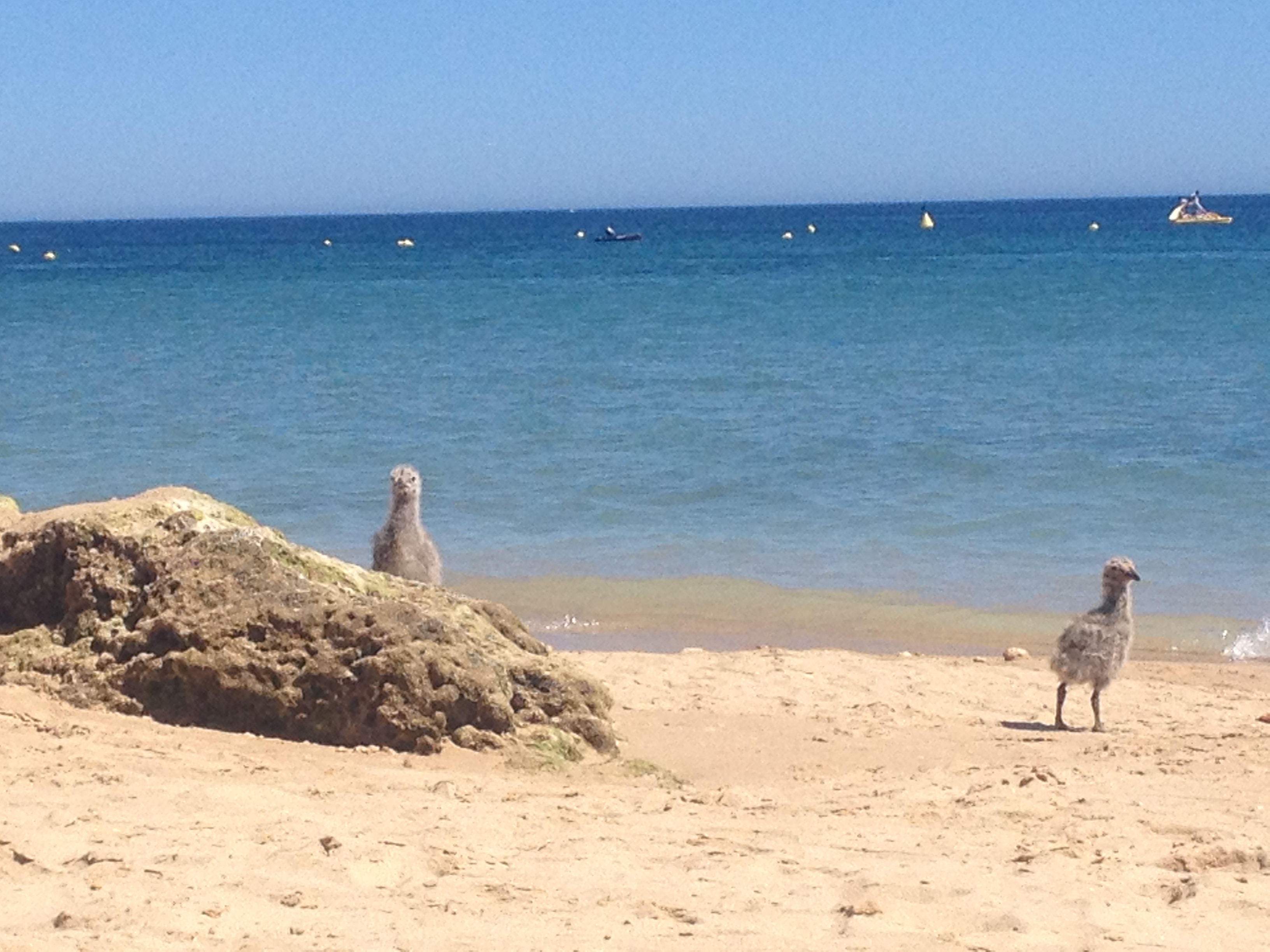 Nämä raukat sisarukset, kun jossain vaiheessa erkanivat toisistaankin, jonkin ajan kuluttua kuitenkin löysivät toisensa lähellä vettä ja vähän joivat, en muuten koskaan ole nähnyt lokin läähättävän, nyt näin. Aallon tullessa raukat menivät sitä karkuun, joten uimataitokaan ei ollut kehittynyt. Kun lähistöllä ei ollut ihmisiä, emo laskeutui myös hiekalle ja jutteli poikasille jotain, lienevätkö olleet jäähyväiset, koska eihän tuossa mitään ollut tehtävissä. Pesä on monen metrin korkeudessa jyrkän kallion päällä, eikä lentotaitoa ollut.