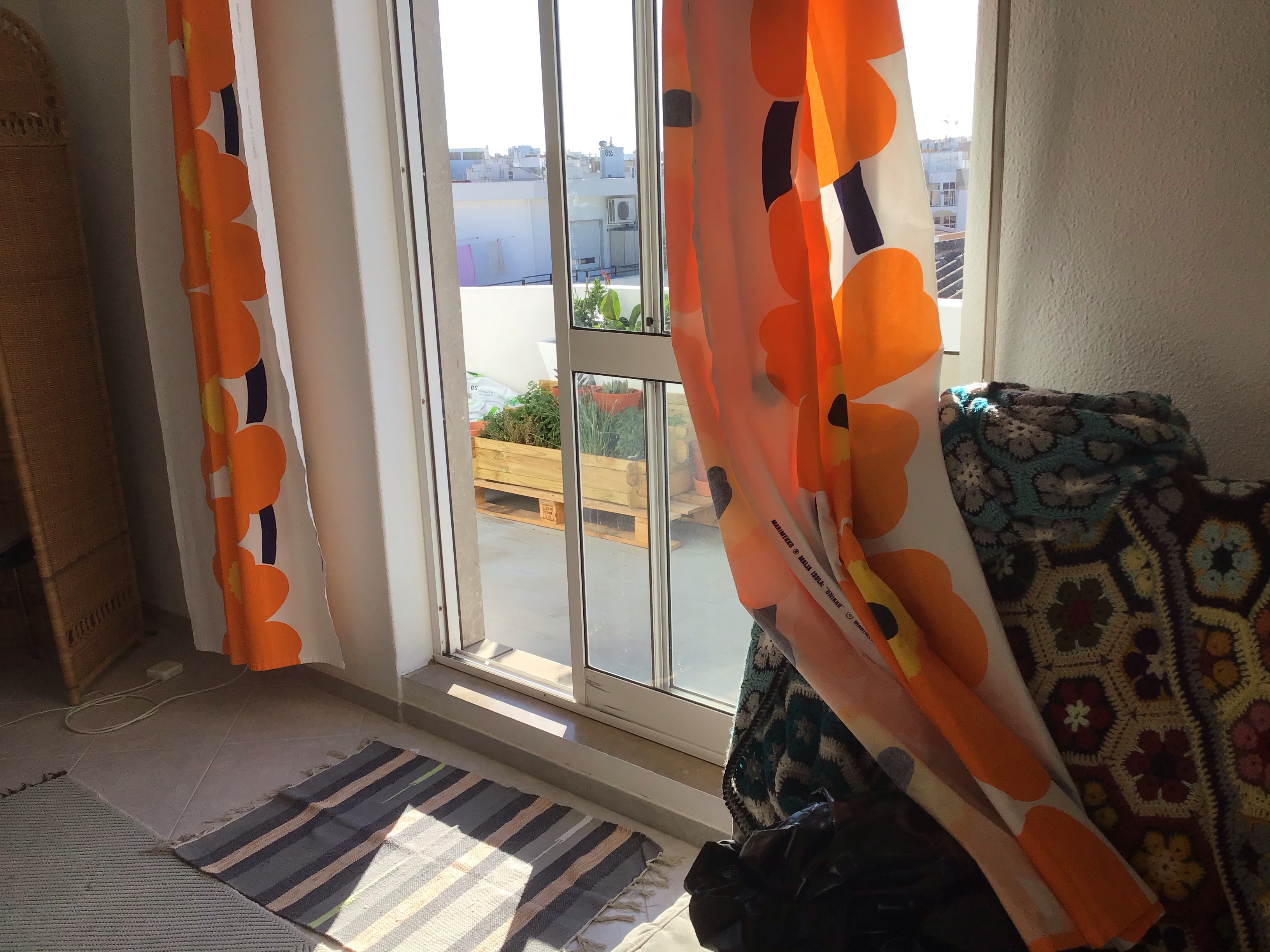 Kun tuuli on kova, se on tässä asunnossa todella kova, ja tietty ulkona myös. Jännityksellä aina seuraan, pysyvätkö kasvit pystyssä ruukuissaan ja telineessään. Toistaiseksi ovat pysyneet. Sisällä sen sijaan matot, liinat ja verhot kyllä lentävät, jos pitää ikkunoita ja ovea auki.