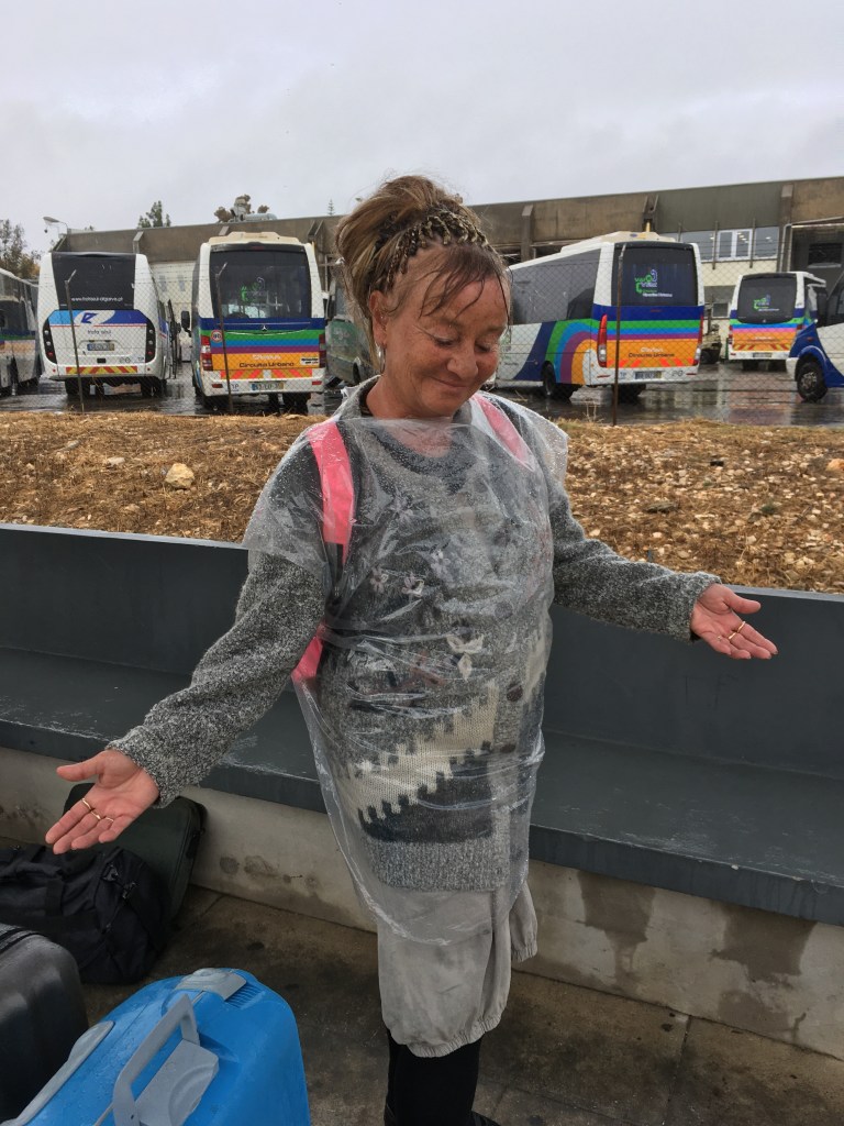 Sade loppui ihan yhtä äkkiä, kuin se oli alkanutkin, joten laitoin läpimärän muovipussin asemalaiturin roskikseen ennen junaan menoa.