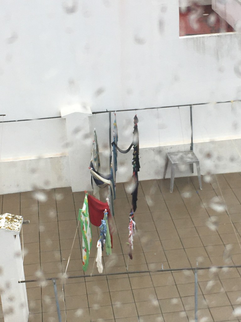 Jos on sattunut ripustamaan pyykit ulos ja tulee sade, ei niitä yleensä haeta sieltä pois. Tuleepahan vähän ylimääräistä huuhtelua. Ja sitäpaitsi ylimääräinen kosteus sisällä ei ole hyväksi. Olen nyt seurannut meidän keittiön ikkunasta talon tuuletusparvekkeelle ripustettuja vaatteita, jotka huuhtoutuvatkin todella tehokkaasti. Ja monen päivän ajan. Mutta mielestäni portugalilaiset ovat optimistisia, ja he tietävät, ettei sade kestä ikuisesti ja auringossa on voimaa talvellakin.
