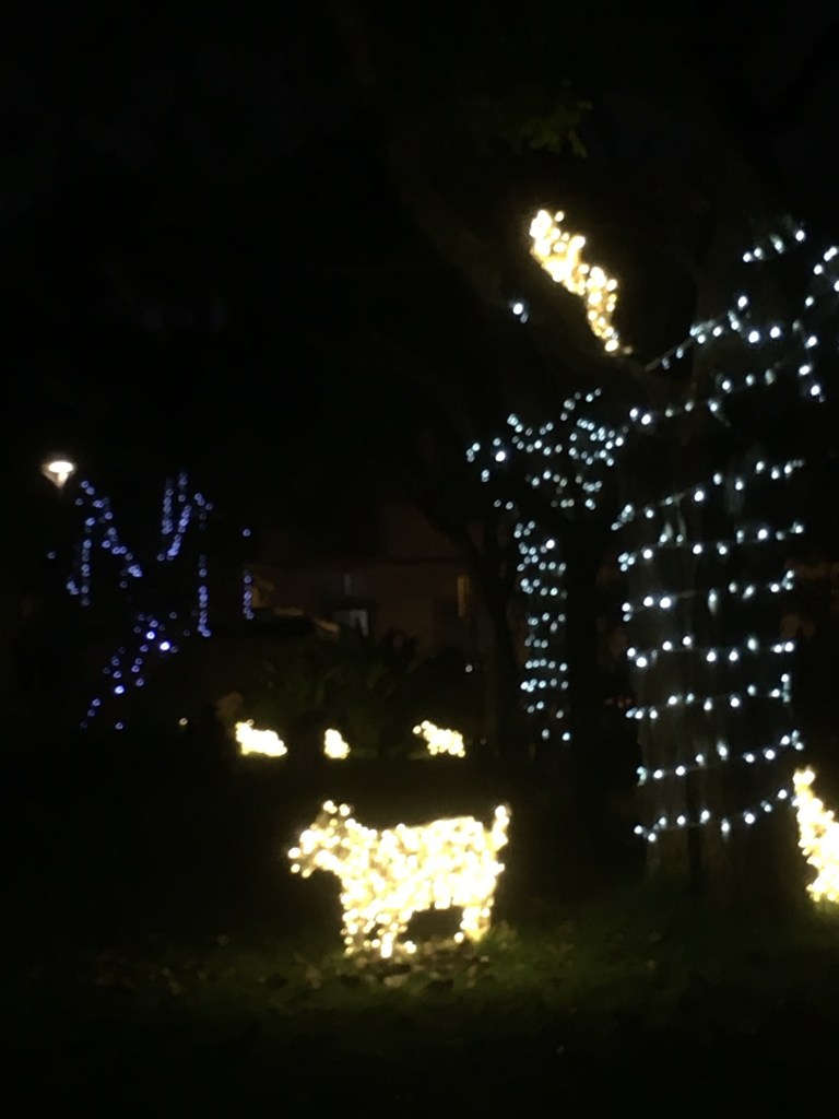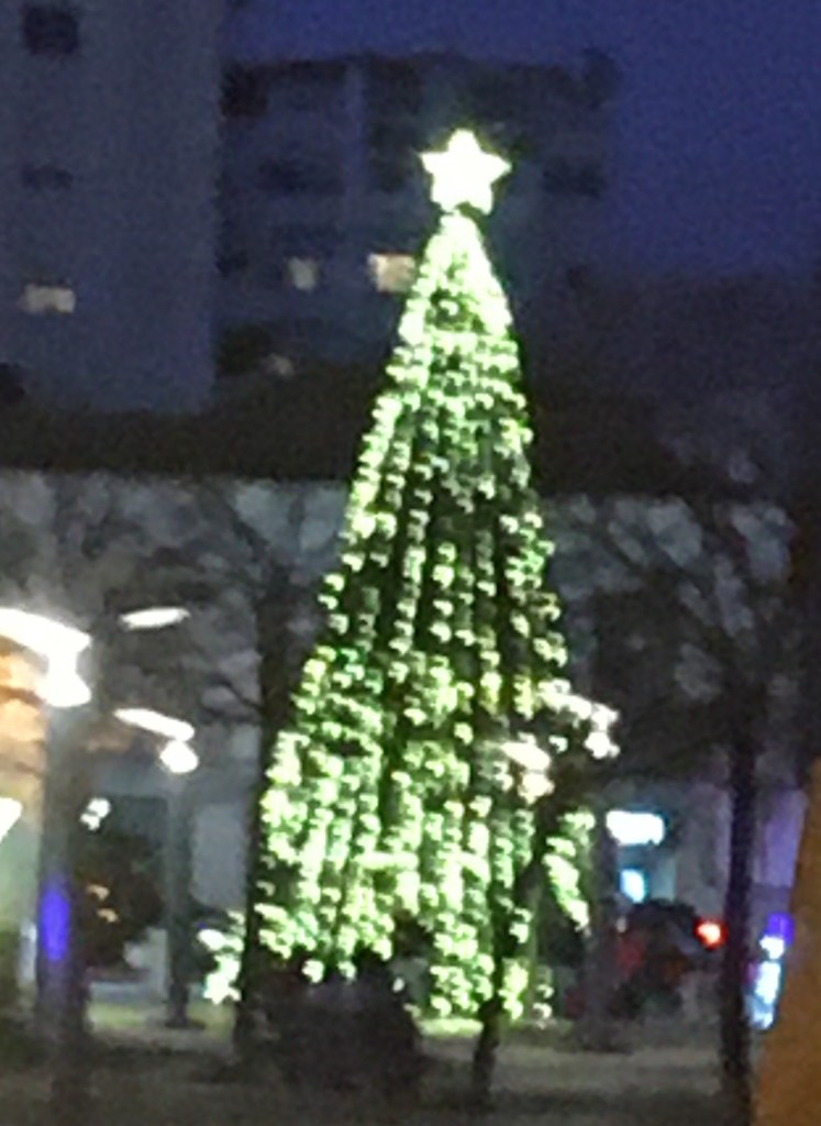 Joulukoristeita ja -valoja sekä päivällä että illalla