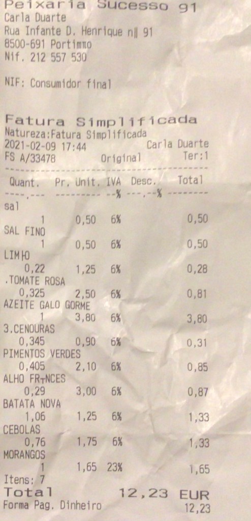 Tämä on lähinnä Suomessa asuville tiedoksi, ihan tavallinen kalakaupan kuitti, kalakaupan, jossa myydään myös vihanneksia ja hedelmiä, EIKÄ siellä haise kalalle! Käännän kuvan alle, mitä tuolla noin kahdellatoista eurolla saa.