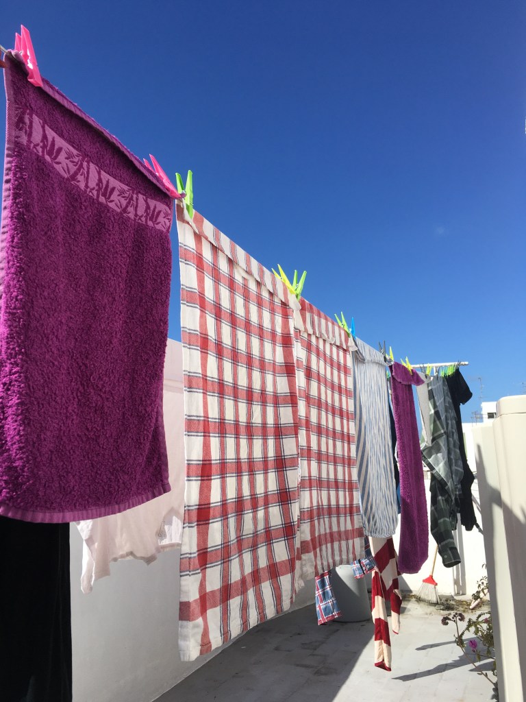 Hyvä sää tietenkin aiheuttaa megalomaanisen pyykkipäivän. Villasukkia, pitkähihaisia paitoja, legginsejä, pyyheliinoja ja lakanoita on pyöritetty tänään oikein urakalla, koska nyt ne oli mahdollista saada kuiviksi ulkona.