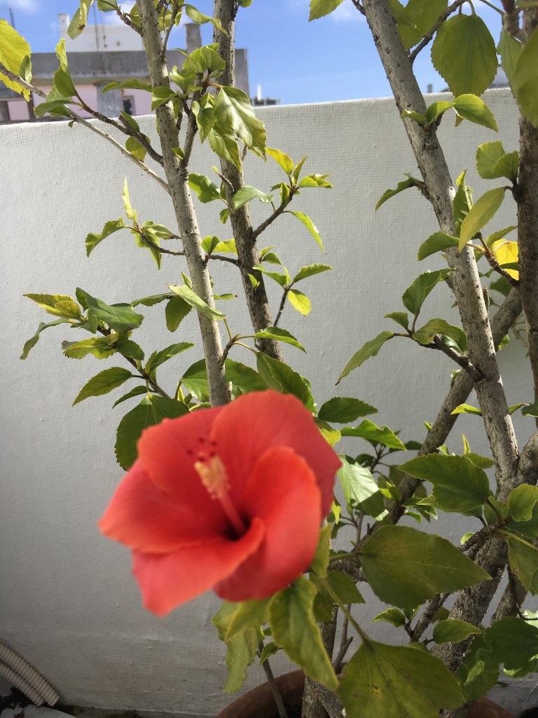 Hibiscus on avannut pari kukkaa. Myrsky, tuuli ja kylmyys saivat edelliset nuput näivettymään.