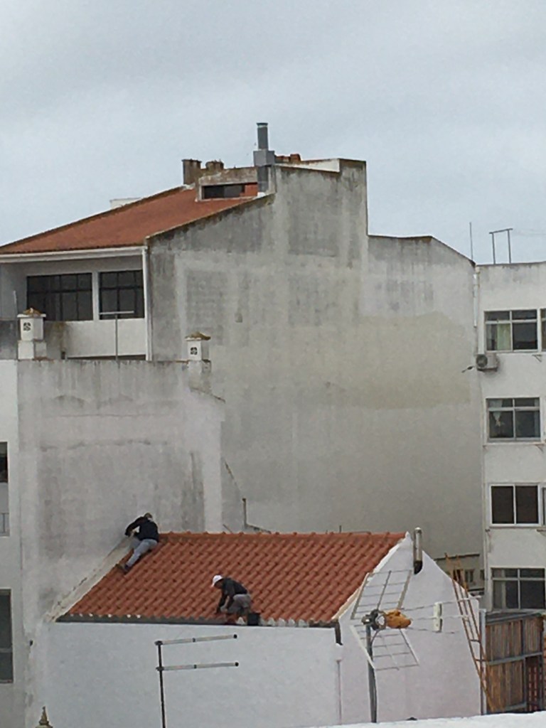 Vastapäisellä katolla tehtiin tänään remonttihommia. Toinen miehistä puhui paljon puhelimessa, toinen teki enemmän töitä. Arvata saa, kumpi on pomo! Kyyhkysparvet lentelivät minunkin aamukahvieni ylitse vauhdilla ja matalalta. Sitä suhinaa, joka siivistä lähtee, pelästyy ihan kunnolla, jos ei osaa varautua. En ikinä uskaltaisi mennä tuonne katolle keikkumaan. Luulen, ettei tarvittaisi kuin yksi kyyhkyslaivue tarpeeksi matalalla ohilennolla, niin tipahtaisin alas. Onneksi ei tarvitse mennä kattotöihin.