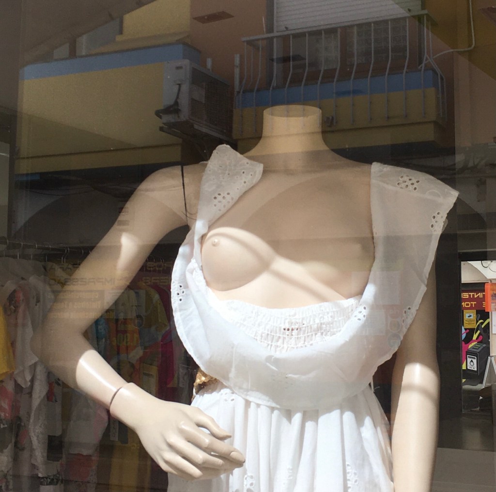 Viime viikolla kävelin erään naisten vaatteita myyvän liikkeen näyteikkunan ohi. Kyseessä oli aika kalliita naisten vaatteita myyvä putiikki, en ole koskaan ostanut sieltä mitään. Myyjä oli lounastauolla ja ikkunassa paistatteli muun muassa päätön mallinukke yllään muuten kaunis, valkoinen, pitkä, romanttissävyinen mekko, mutta jostain syystä romanttinen pitsikaula-aukko ulottui pitkälle mallinuken rintojen alle niin, että ne jäivät kokonaan esiin. En ostaisi!
