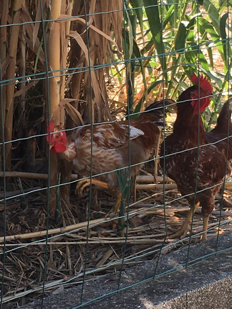 Eilen kävimme yhden tutun maatilalla tarkoituksenamme kastella appelsiinipuita, koska hän itse on Suomessa tällä hetkellä. Maantietä kävellessämme ohitimme kanalan, jossa oli kanojen lisäksi pari komeaa kukkoa. Ne reagoivat kovaäänisesti, kun pysähdyin niitä kuvaamaan. Onneksi välissä oli aita.