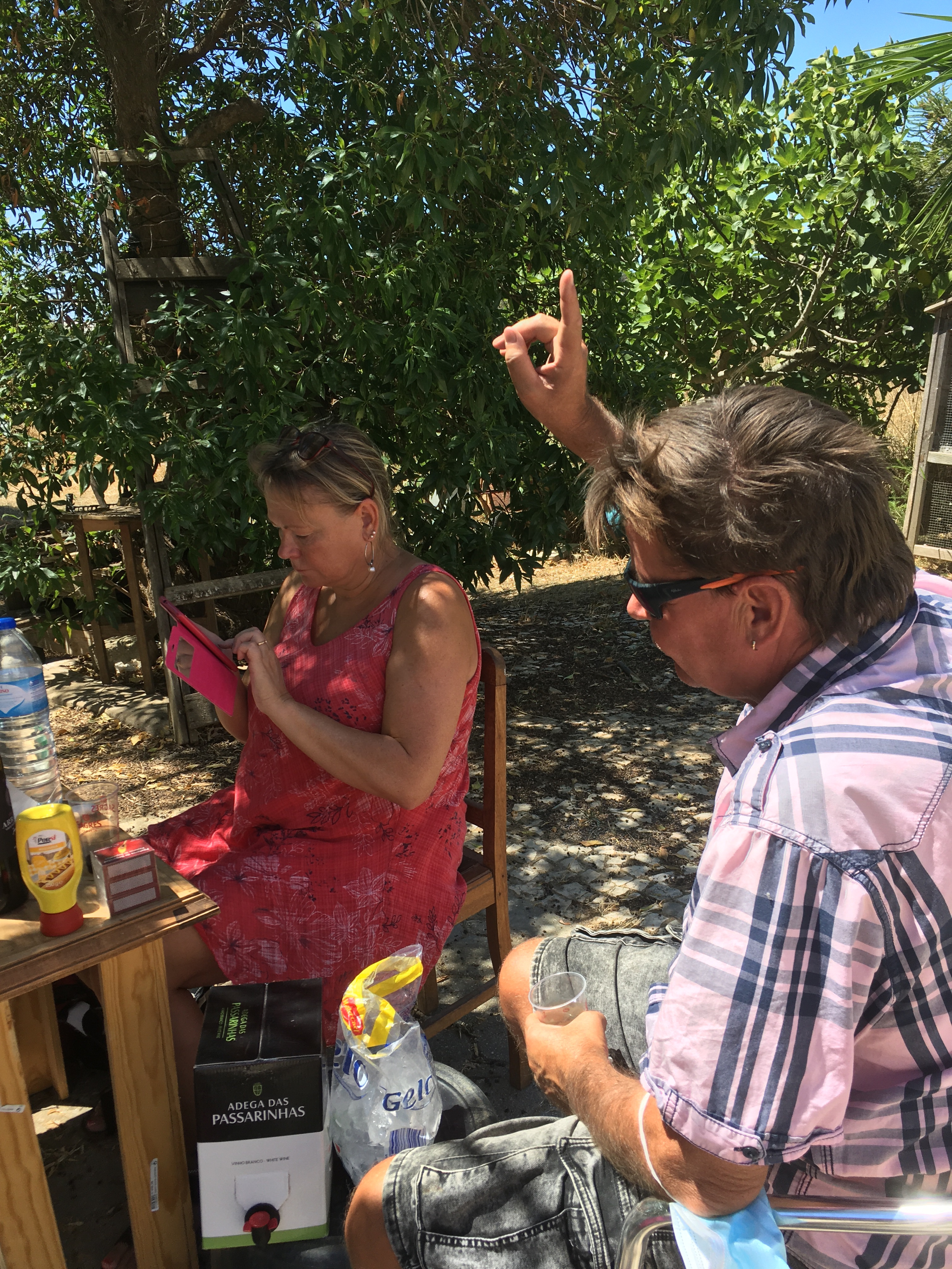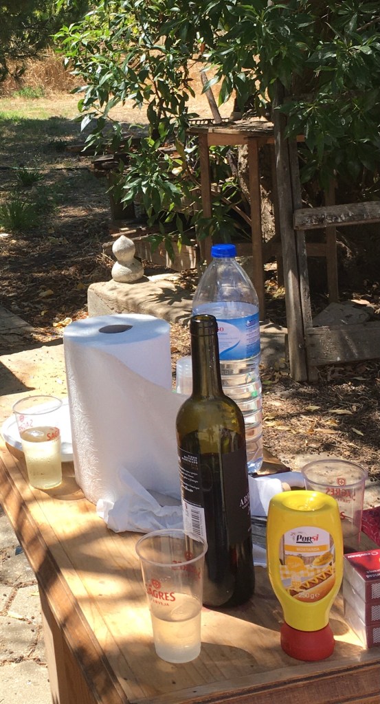 Hiukan pientä kommunikaatiokatkostakin oli ollut, koska talon avain ei enää ollut paikallaan, se oli viety pois. Yksi meistä lähti kylälle kauppaan ostamaan kaikkea tarpeellista. Muovimukeja, veitsen, kaksi kiloa jääkuutioita, talouspaperia, lisää juomavettä, korkinavaajan ja kissanruokaa talon pihassa pyöriville kahdelle kissalle.