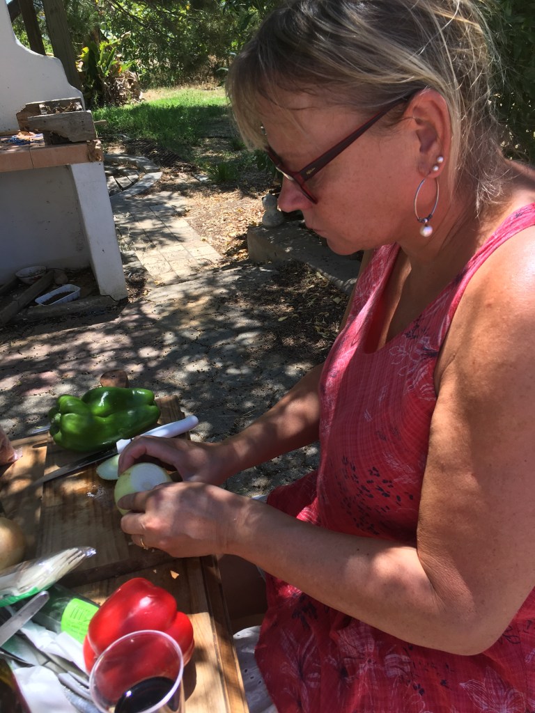 Ruokapöytäkin löytyi pihalta, mutta se oli kyllä aika pieni, joten muovisaavi ylösalaisin käännettynä toimi apupöytänä. Ja grilli tietenkin on ulkona pihalla, joten saimme ruokaa aherruksen päälle.