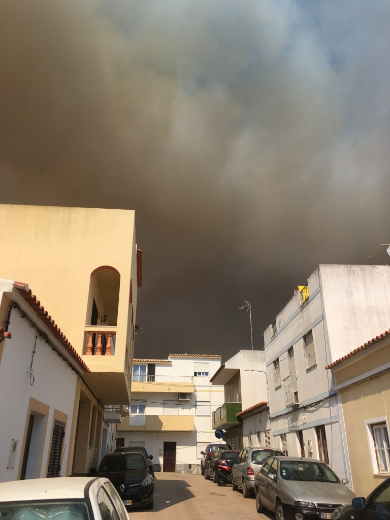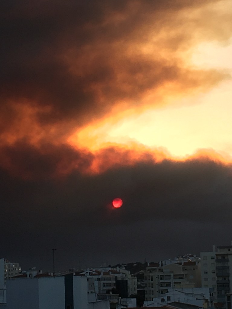 Tummia pilviä ei taivaalla näkynyt ja oli oikein mukavaa, kunnes taivaalla alkoi näkyä tummaa savua. Monchiquen vuoristossa oli syttynyt tulipalo. Lähdimme tallustelemaan kohti kylää, josta löysimme kuppilan, mistä saattoi tilata taksin takaisin kotikaupunkiin. Taksia odotellessa nautimme valkoviinilasilliset jäillä. Ja oli kyllä edullisimmat viinit ikinä – 60 senttiä lasi.