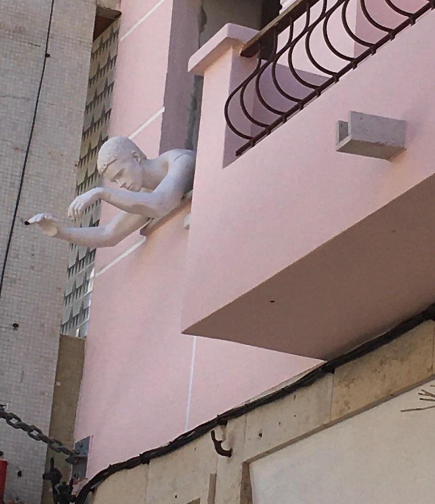Tätä taloa on remontoitu pitkään, alakerrassa olevaa liiketilaa pitää vielä remontoida lisää. Hassu, kalpea ja jäykkä kaveri on ollut milloin jommalla kummalla parvekkeella tai sitten kurkkimassa ikkunasta, kuten kuvassa. Mikähän siinä on idea? Ehkä hän on vain ollut maalareiden tiellä ja sen vuoksi joutunut siirretyksi paikasta toiseen.