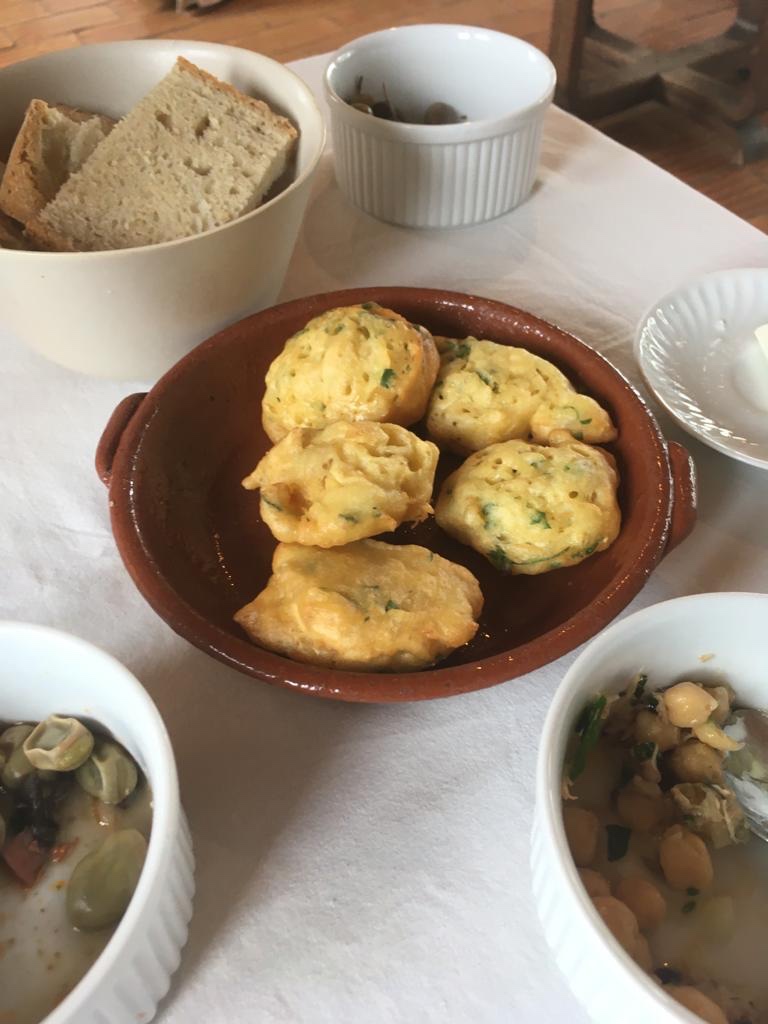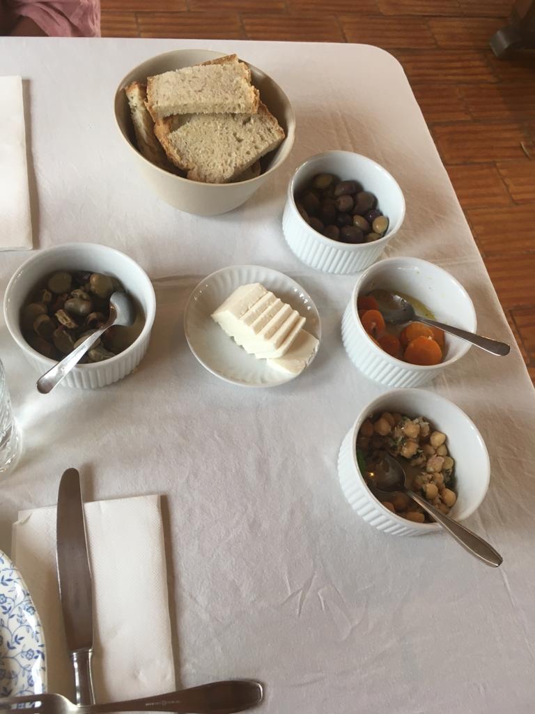 Alkupaloiksi saimme tuorejuustoa, maustettuja porkkanasiivuja, oliiveja, leipää, tonnikalakikhernesalaattia ja algarvelaista papusalaattia, josta ei ihan tarkkaan tiennyt, mitä kaikkea siinä oli, mutta kaikki maistui NIIN hyvältä. Lisäksi tilkka tilan valkoviiniä, jonka maku oli tasan tarkkaan suunniteltu yhteensopivaksi kaikkien ruokien kanssa.