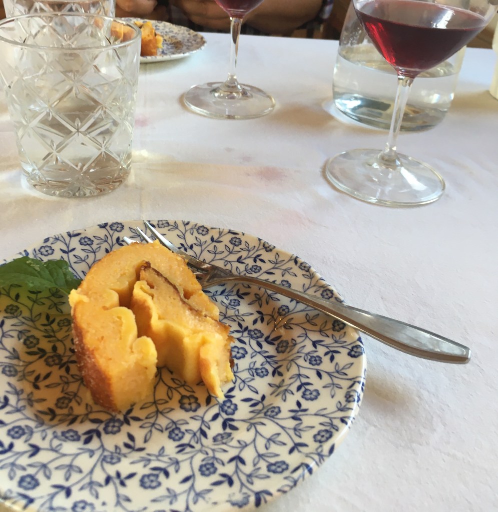 Jälkiruoaksi tarjottiin tyypillistä portugalilaista appelsiinitorttua, jollaista olen ennenkin maistanut, mutta tämä oli paljon parempaa kuin aiemmat maistelemani. Lisäksi erilaista punaviiniä kuin lihan kanssa. Se sai appelsiinitortun ihan sulamaan suussa. Kyllä olivat kaikki maut todella tarkkaan suunniteltu yhteensopiviksi.
