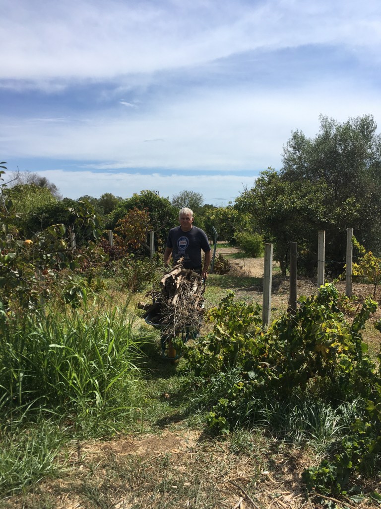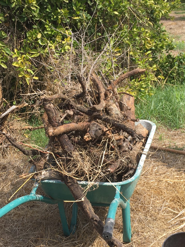 Hedelmäpuista irrotettuja kuivuneita oksia käytettiin grillissä. Eikä niitä tosiaan tarvittu enempää kuin kottikärryllinen.