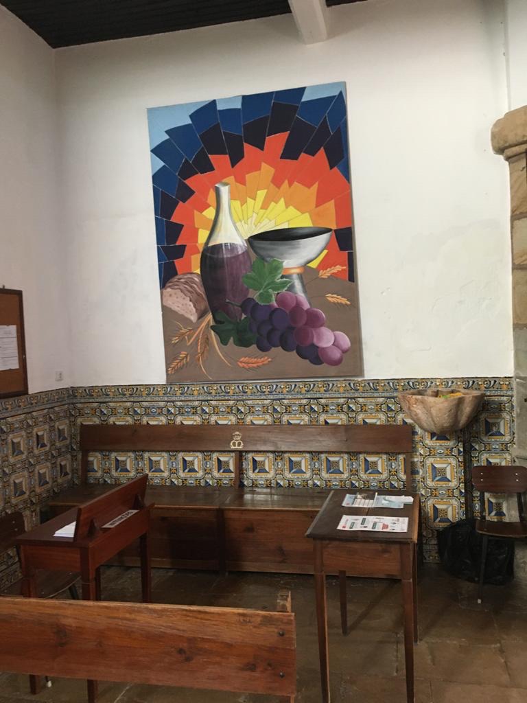 Ja tietenkin, kun viinimaassa, Portugalissa, ollaan, niin jopa kirkon seinällä – tietty kaiken normaalin kirkollisen taiteen lisäksi – on myös viiniaiheinen maalaus.