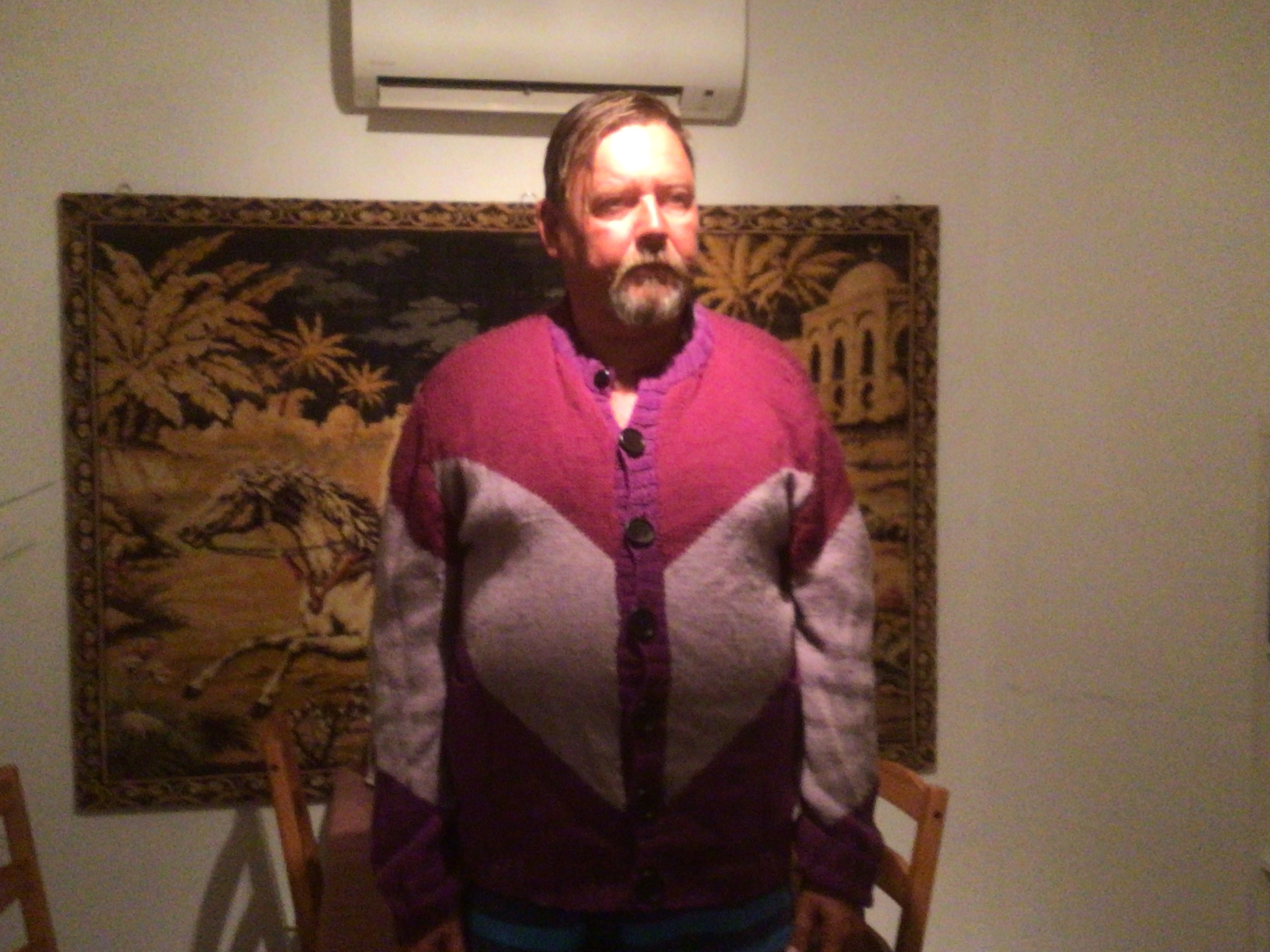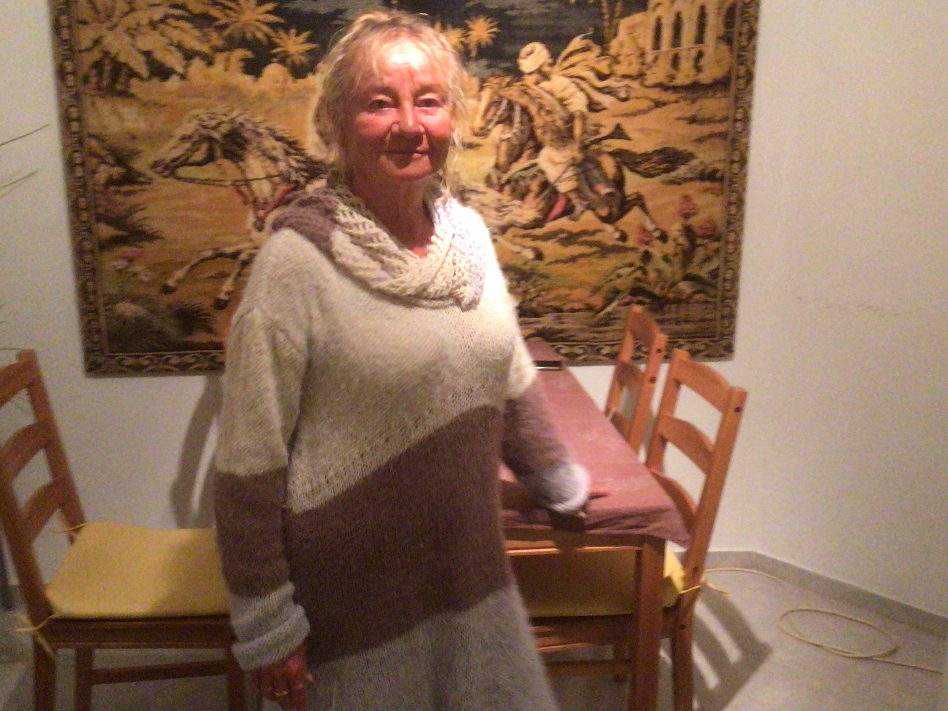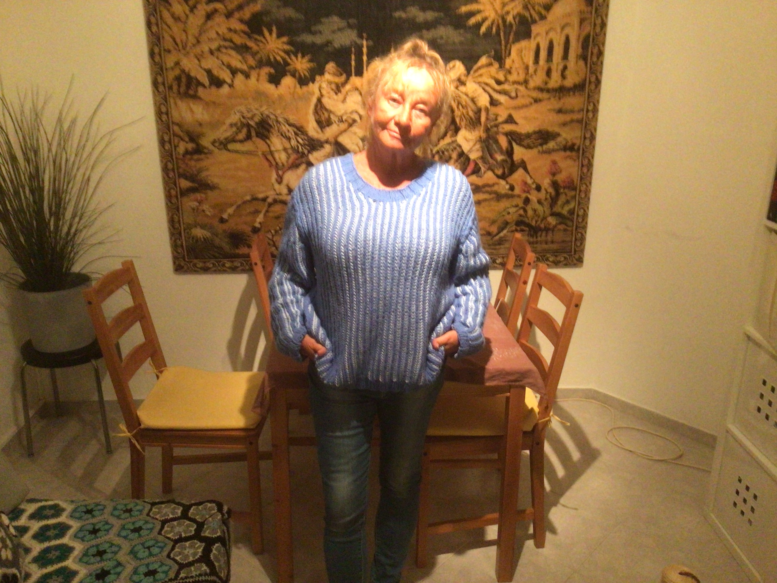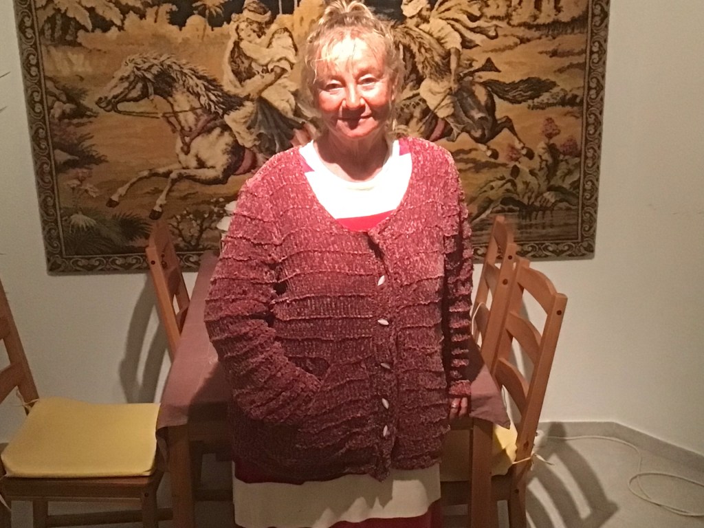 Tuosta langasta olen myös tehnyt lahjaksi toiselle ystävälleni pyöreän villatakin. Kuva takista on minun päälläni kauan sitten, synttärit olivat viime juhannuksena.