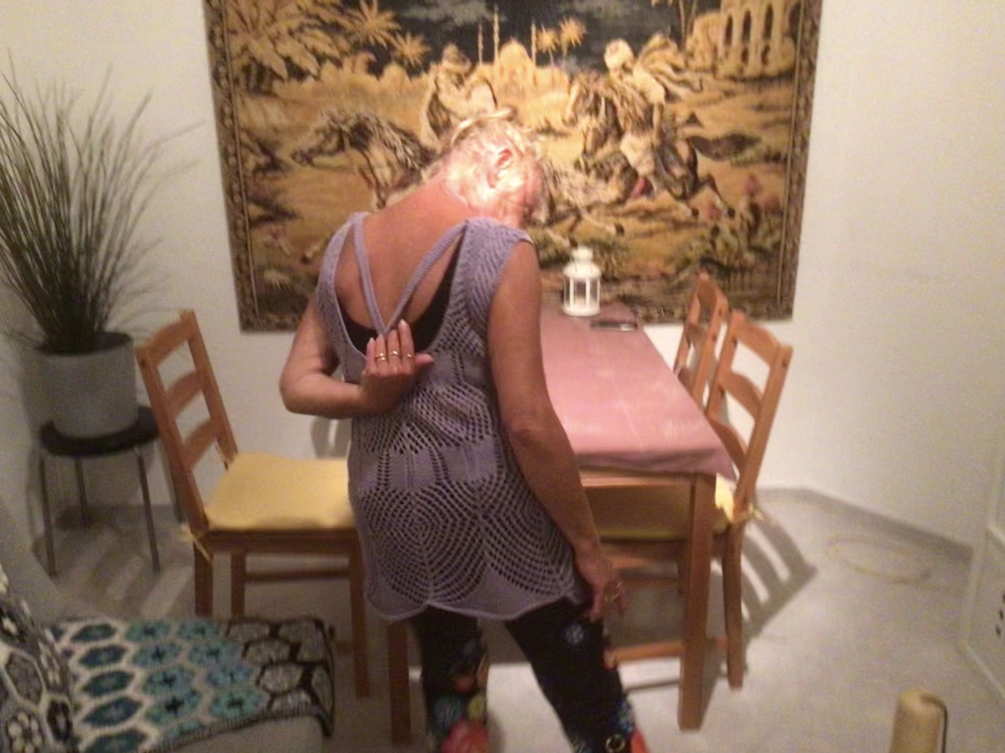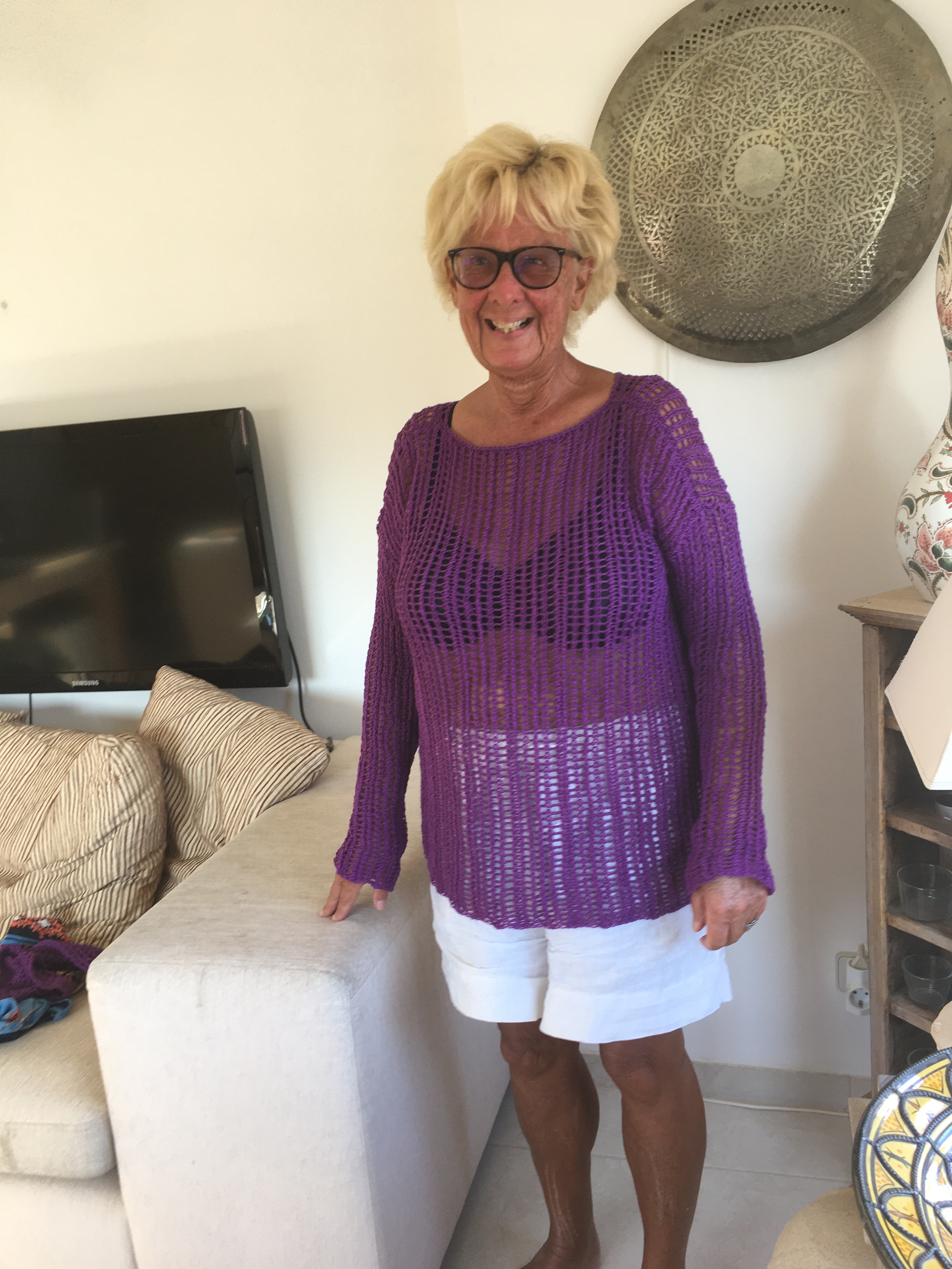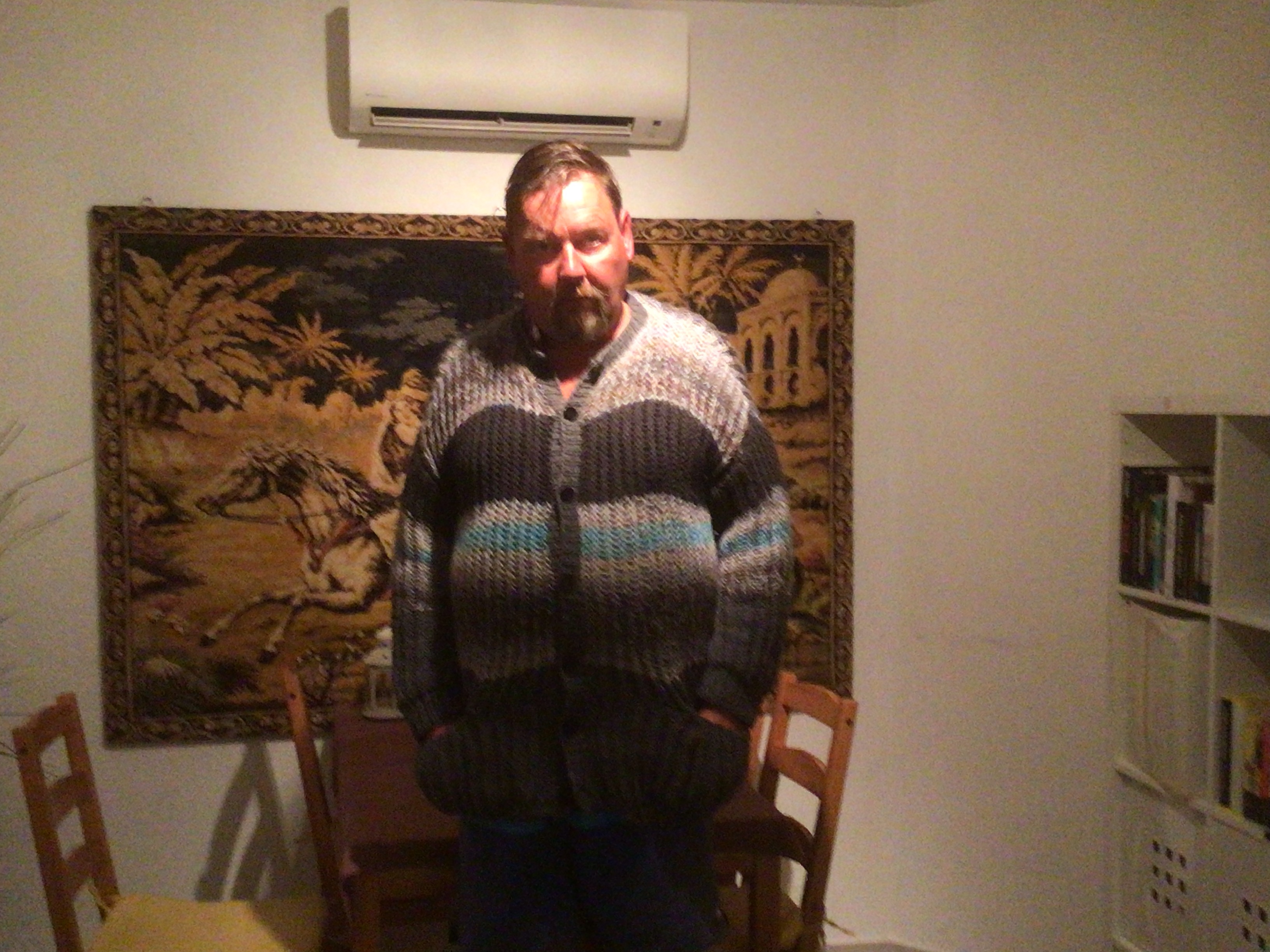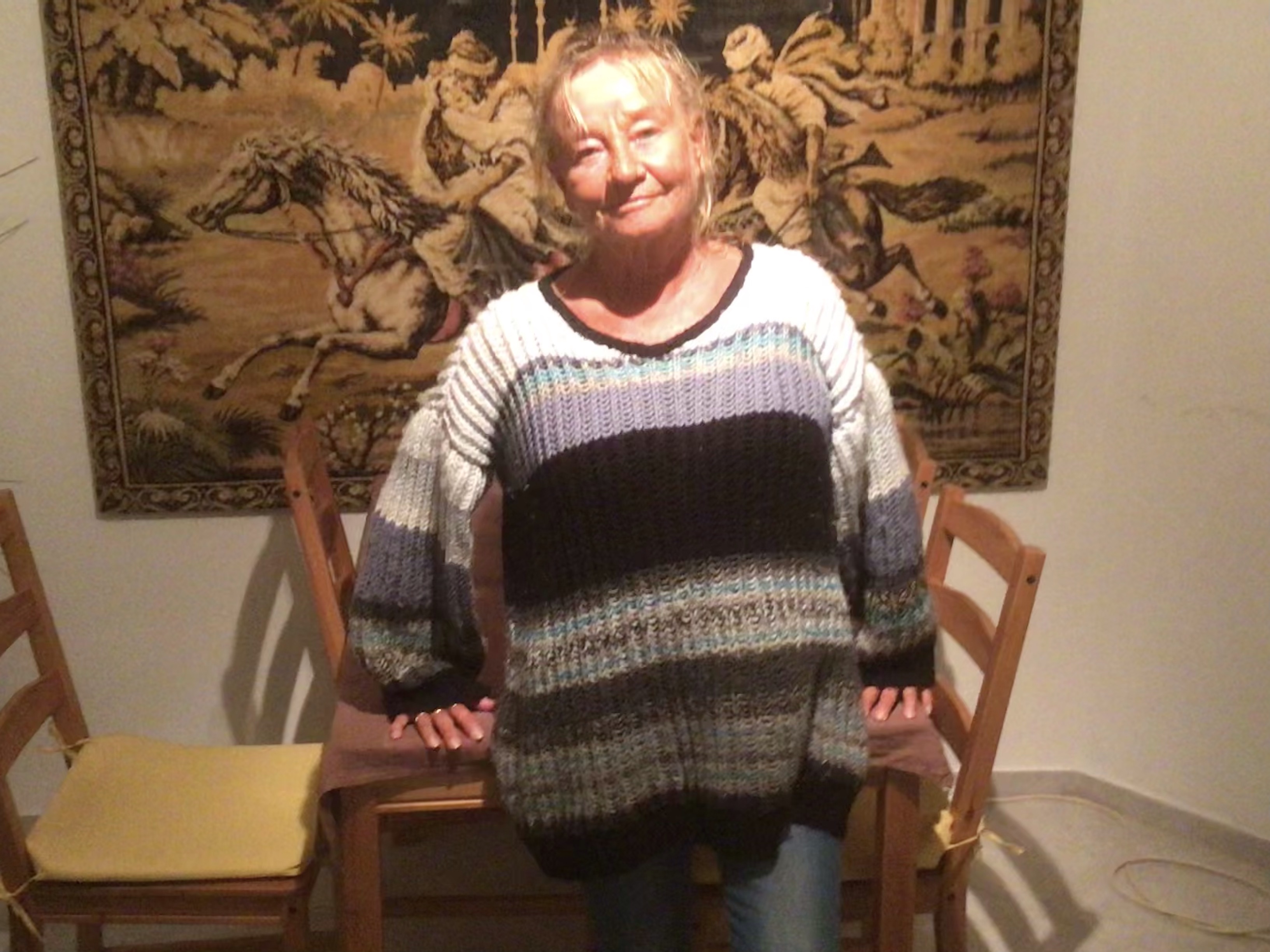 Tuosta langasta olen myös tehnyt lahjaksi toiselle ystävälleni pyöreän villatakin. Kuva takista on minun päälläni kauan sitten, synttärit olivat viime juhannuksena.