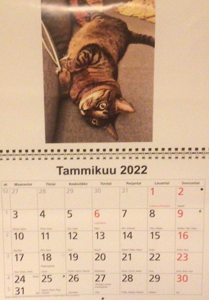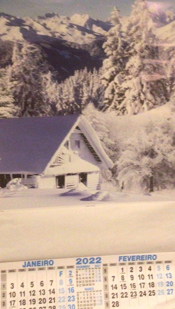 Rappukäytävässä taloyhtiön puheenjohtaja oli antanut Jounille lahjan. ’Kivan’ lumimaisemakalenterin! Hän varmaan luuli, että se tuottaisi meille iloa nähdä lunta, heh! Ei kyllä tuota! Se etu tuosta uudesta kalenterista kuitenkin on, että oppiipahan kirjoittamaan kuukausien nimet oikein, kun niitä aina pari kuukautta kerrallaan katselee tuossa seinällä. Tähän mennessä olen jo oppinut, että helmikuussa on se toinenkin E-kirjain, fevEreiro, se ei juurikaan äänny, joten väärin olisin kirjoittanut ilman kalenteria. Kuva tietenkään ei vaihdu koko vuonna, vain alaosa kalenterista vaihdetaan uuteen.