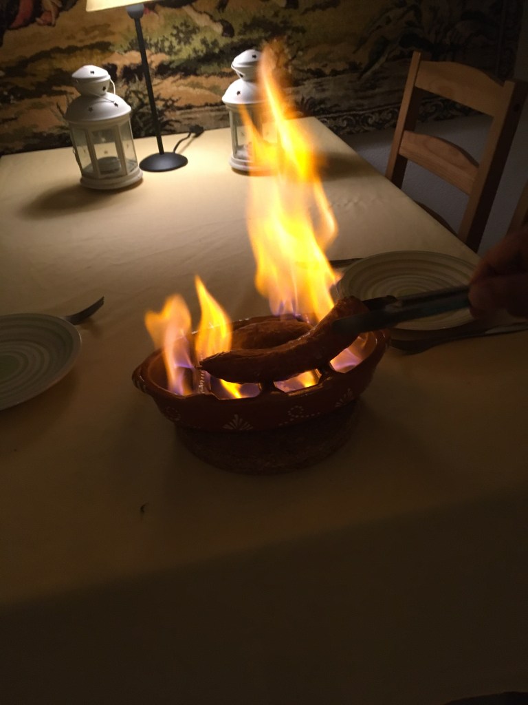 Saimme joululahjaksi astian, jossa voi liekittämällä kuumentaa ruokia. Kuvassa on chorizomakkaraa käristymässä. Ja kylläpä olikin maukasta ja hyvää! Lisäksi tuollainen elävällä tulella kuumentaminen on todella tunnelmallista. Haistelin spriitä, jolla liekittäminen tapahtuu ja minusta se haisi ihan desinfiointiaineelta, joten Jouni kysyi vielä uudemman kerran kaupasta, että voiko tätä tosiaan käyttää liekitykseen, ja vastaus oli jo toisen kerran kyllä. Makkara ei maistunut desinfiointiaineelle.
