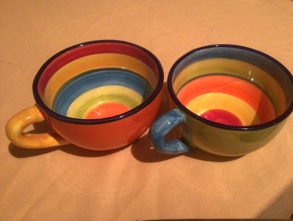 Jo kertaalleen aikaisemmin olen käynyt keramiikkamyymälässä, jossa ihailin niin tyylikkäitä ja värikkäitä esineitä. En kuitenkaan raaskinut ostaa silloin kahvikuppeja, joita himoitsin, koska ne maksoivat kympin kappale. Eilen sitten päätin, että NYT! Joten vihdoinkin meillä on tarpeeksi isot kahvikupit ( n. 3 desiä), ettei tarvitse koko ajan juosta kahvikoneella hakemassa lisää. Ja käsinmaalatut värit ovat sellaiset, että niitä katsellessa herää paljon pirteämmin.