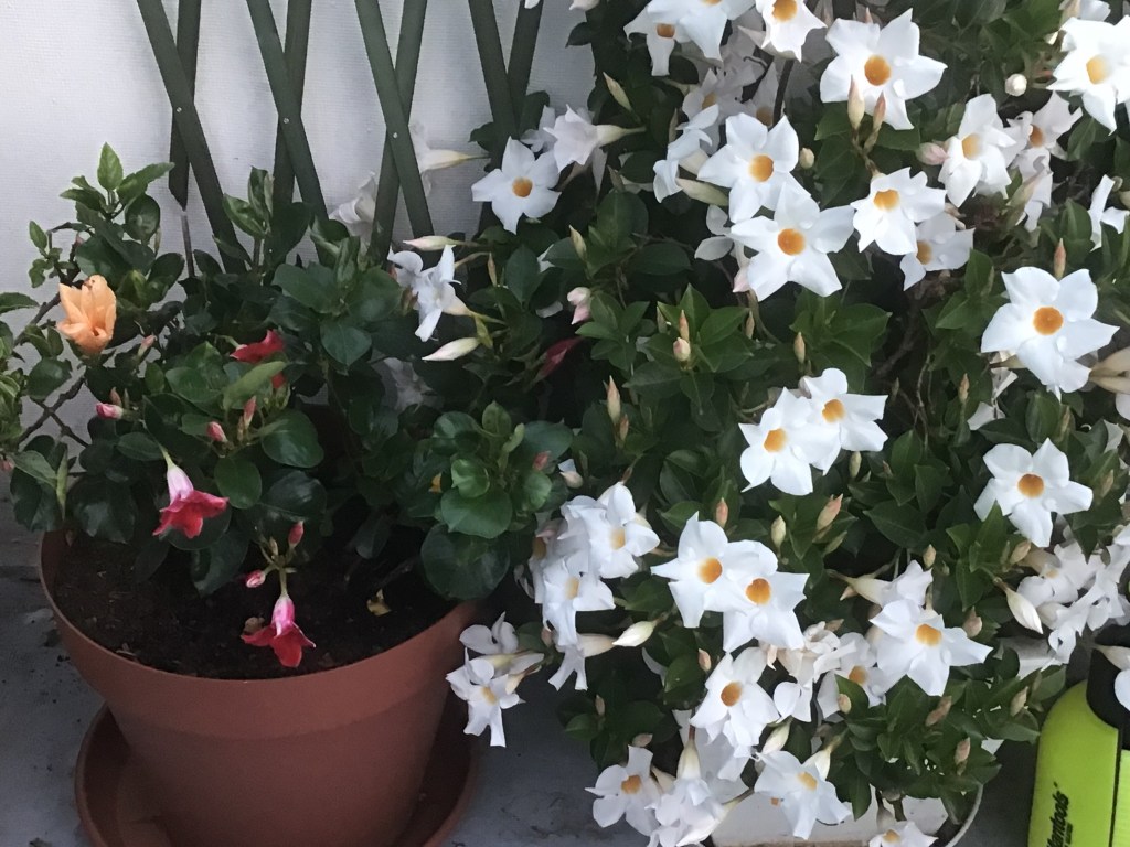 Valkoinen maljaköynmös tuntuu viihtyvän, ja nyt juuri tuon muuton johdosta se sai vierelleen punaisen kaverin, minullakin oli jossain vaiheessa tuollainen punainen, mutta se vaan nuupahti. Tälle uudelle tulokkaalle toivon nyt menestystä.