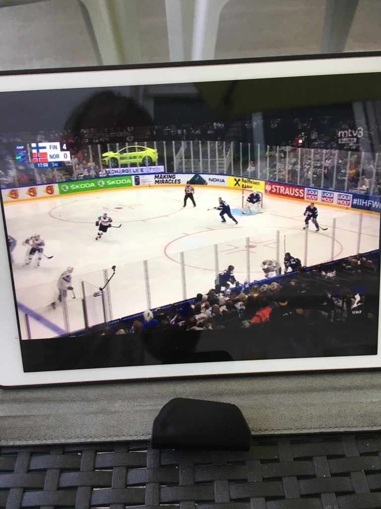Jääkiekon MM-kisojakin olemme päässet seuraamaan ihan kotona pieneltä padin ruudulta. Viime lauantaina meitä oli enemmänkin porukkaa tuttujen luona, kun piti katsoa ensin lätkämatsi ja sitten euroviisut, mutta eikös tämä padi sitten mennyt ihan mustaksi ja LAKKASI TOIMIMASTA. Mikä lie? Euroviisujen tulokset sitten katsoa tihrutettiin yhden vieraan puhelimen ruudulta. No, selvisihän se voittaja niinkin.