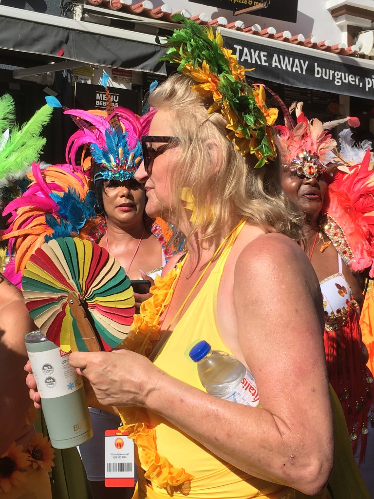 Kulkueessa oli kaiken ikäisiä ihmisiä, osalla huikeita pukuja ja paljon meteliä sekä väriä. Oli todella kuuma päivä, jopa minä olin iloinen, kun aurinko häipyi viereisen talon taakse. Kulkueessa tanssivilla ihmisillä oli vakiovarusteena vesipullot mukana,