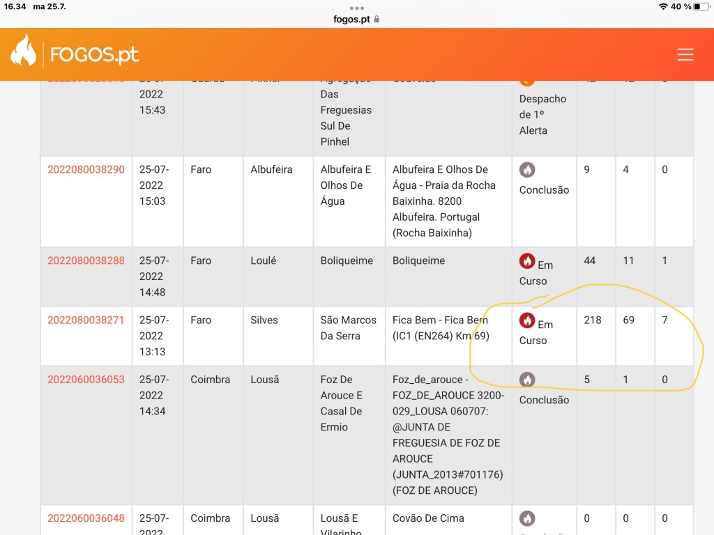 Tässä on linkki tuonne fogos.pt sivustolle, jos kiinnostaa tutkia asiaa tarkemmin. Oikean reunan numeroista näkee, paljonko sammutushenkilökuntaa, autoja ja helikoptereita on sammutustöissä. Palojen saaminen hallintaan on valtavasti parantunut ensimmäisistä vuosista, jolloin olimme täällä. Kunnioitan kovasti kaikkia, jotka tekevät tuota tärkeää ja raskasta työtä.