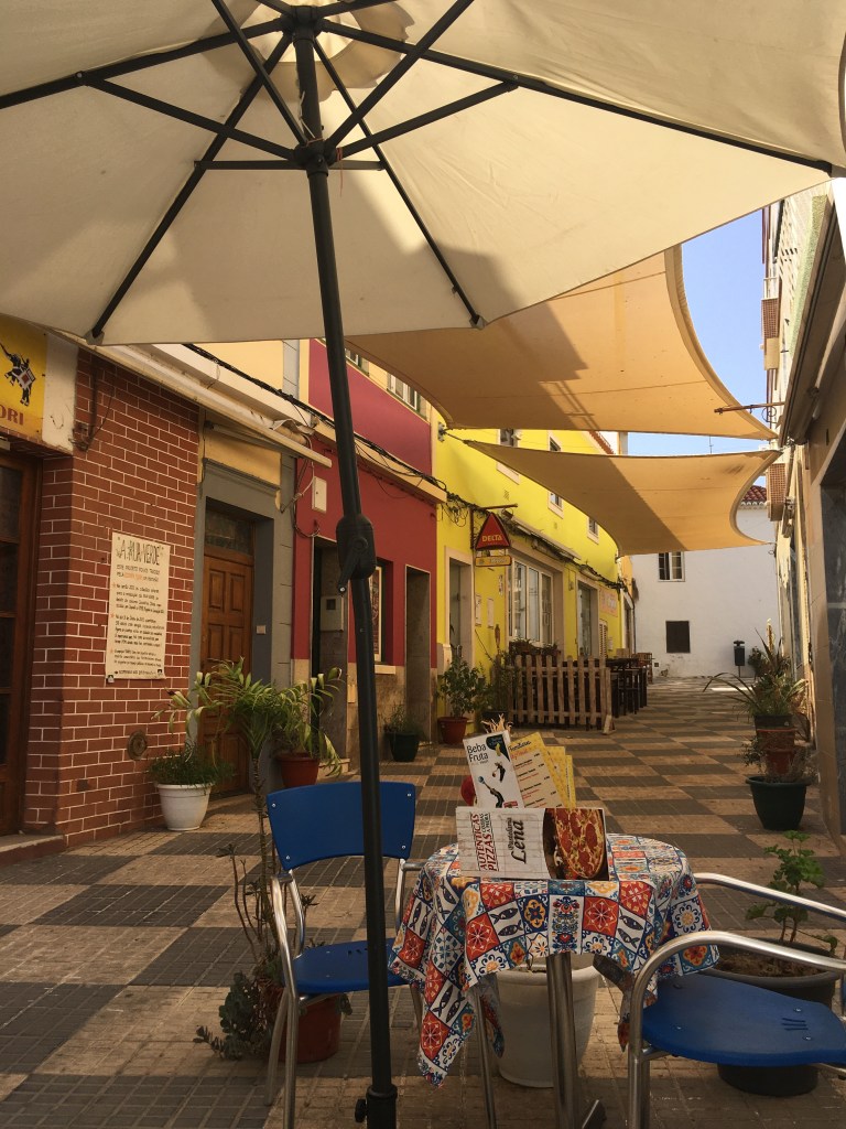 Vielä yksi kaupunkikuva muutama päivä sitten, koska siinä on niin hauskan värikkäitä taloja. Tuolloin pystyi vielä liikkumaan kaupungilla ja istumaan kahvilassa varjon alla. Olimme tulossa rannalta, missä toki piti koko ajan käydä uimassa, ettei pakahdu. Parin päivän päästä tämän superhelteen pitäisi laantua normaaliksi kolmenkympin kesälämpötilaksi, sitten pääsee taas rannallekin.