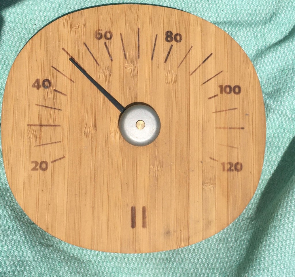 Varjolämpötila on sääennusteen mukaan 38 astetta, apteekin mittari, joka myös mittaa varjolämpötilaa, näytti 41 ja Suomesta tuodulla saunan lämpömittarilla mitattuna auringossa lämpötila oli kello kolmen aikaan vähän päälle viidenkymmenen.
