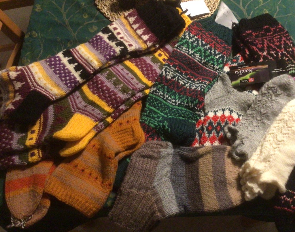 Meikäläisen villasukkavarastot menevät myyntiin, lisäksi olen paistanut hapanlimppuja ja reissumiehiä myyntiin myös. Jännää nähdä, käykö kauppa. Jouluisia tuotteita ovat myös saaristolaisleivät, erilaiset kakut sekä joulupöydän laatikot. Ja tietenkin paljon erilaisia käsitöitä patalapuista servetinpidikkeisiin… kaikkia myytäviä asioita en edes tiedä. Mutta mukava päivä on tulossa, toivottavasti ei sada, että voimme pystyttää pöytämme ulos.