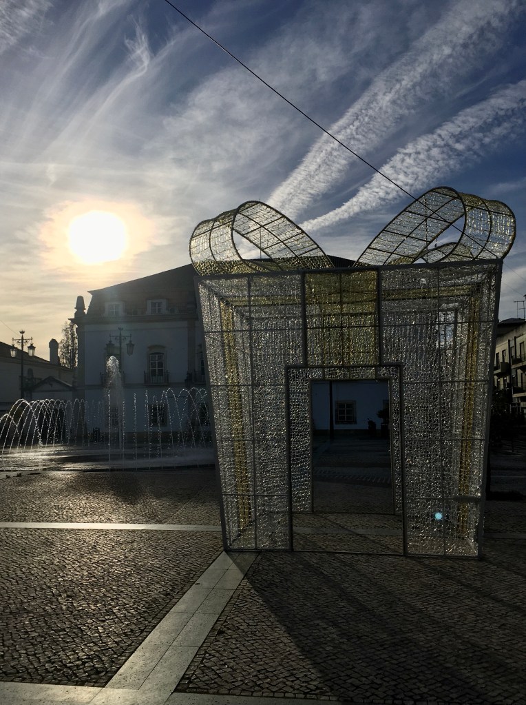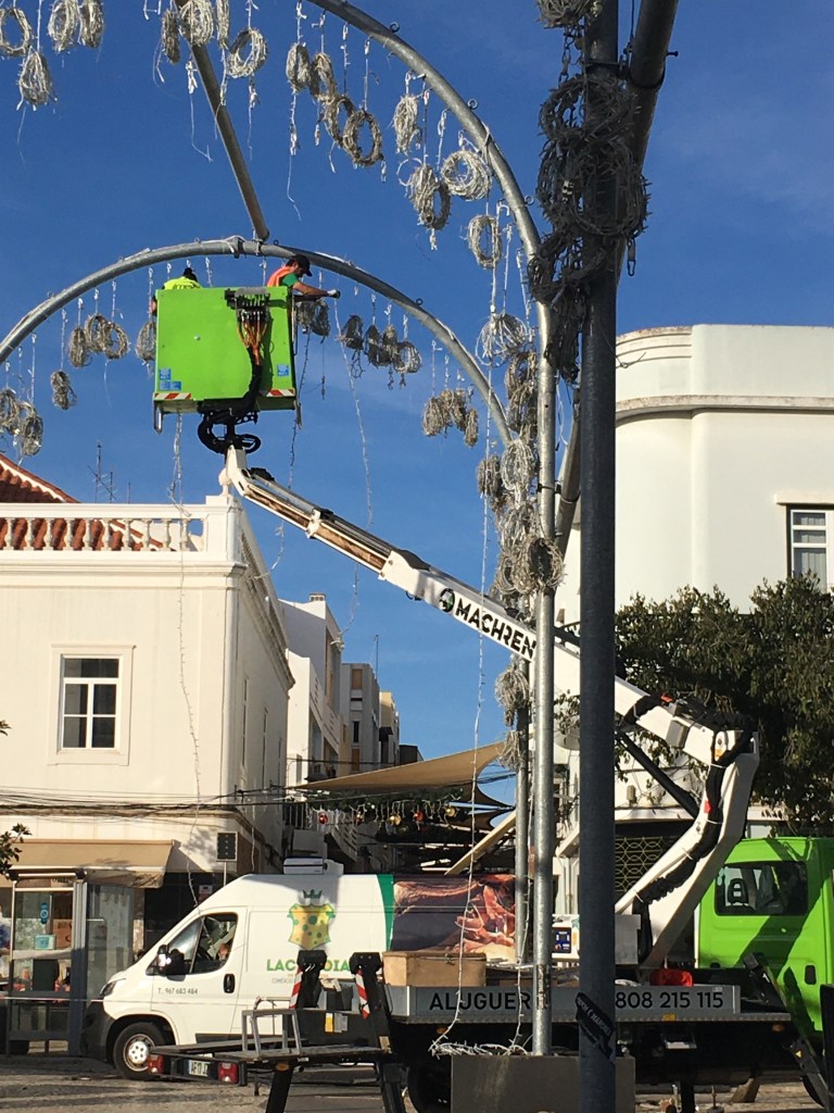 Myös Portimãon kaupunki valmistautuu jouluun. Monille kaduille, kaupungintalon aukiolle ja Alamedalle ainakin rakennetaan kovaa kyytiä taas jotain kaunista valaistusta ja koristelua. Kun olin matkalla kässäkerhoon, kävelin Rua do Comerciaa, siis kävelykatua, pitkin, ja kaiuttimista soi Jouluyö, juhlayö ja muita joululauluja. Aurinko paistoi, ja tunnelma oli lämmin. Tuli hyvä mieli. Alamedalle myös pystytetään jokajouluinen luistelurata, ihan oikeaa tekojäätä ja Mon aukiolle oli seimeä varten tänään jo tuotu eläimiä.