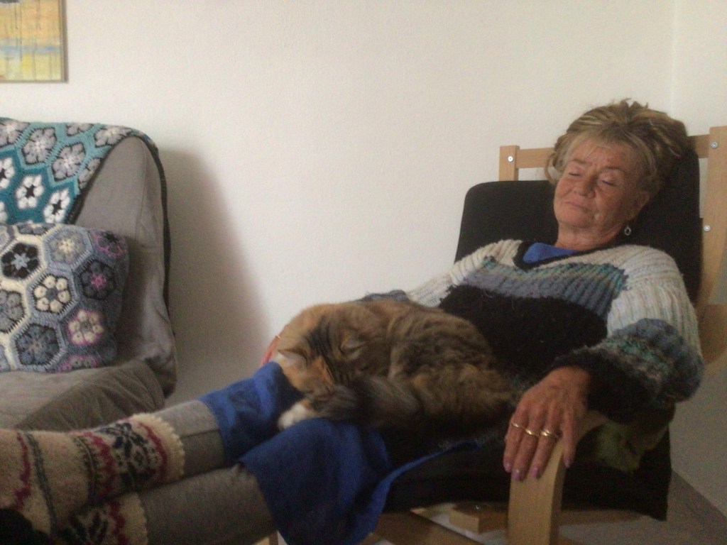 Kissa on oppinut jo niin luottavaiseksi, että se uskaltaa nukkuakin sylissä. Päivittäin kuluu monta tuokiota vain lepäillessä. Ja puolentoista viime viikon ajan se on ollutkin tarpeen, koska sain myyjäisten jälkeisenä päivänä tosi sitkeän flunssan. Eilen oli ensimmäinen päivä, jolloin jaksoin tehdäkin jotain, muutoin olen vain neulonut ja pidellyt kissaa sylissä. Sekä tehnyt kolme covid-testiä, jotka kaikki olivat negatiivisia.