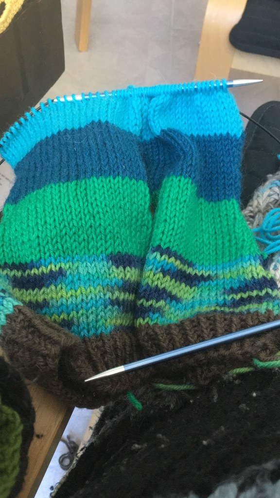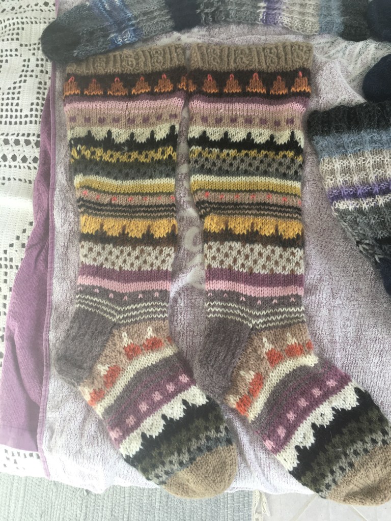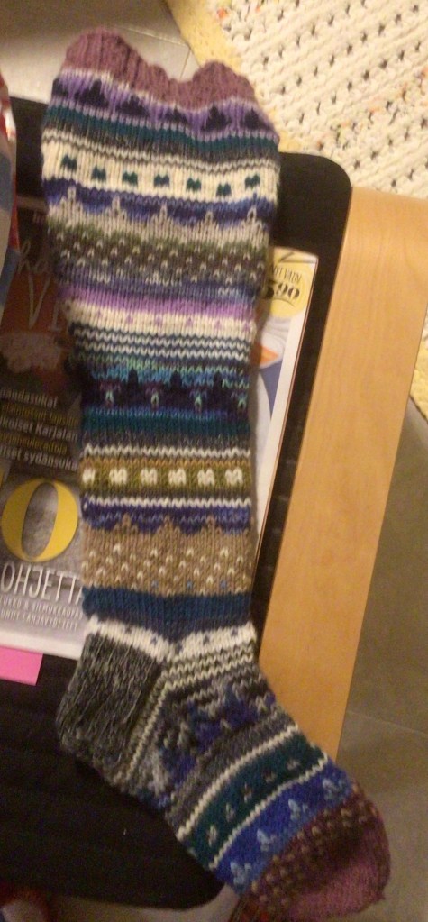 Olen myös tehnyt yhdet sukat looppaamalla, se oli minulle täysin uusi tekniikka, josta idean sain kässäkerhossa ja netissä sitten opiskelin. Kyllä siinä pitikin moneen kertaan katsella YouTube- videoita, että sai kantapäät tehtyä. Nuo loopatut sukat olen jo lahjoittanut eteenpäin. (Jämälangoista nekin)