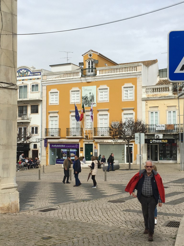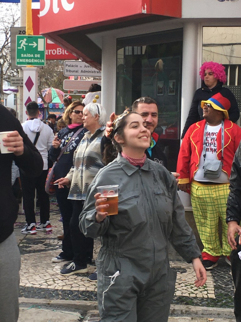 Aikamme käveltyämme löysimme oikeustalon edestä toriaukion, jossa lasten karuselli soitti portugalilaista humppamusiikkia ja aukion laidalla oli koju, josta sai pientä suolaista purtavaa sekä juotavaa. Kioskin ulkopuolella oli kaksi pöytääkin, joten saimme istahtaa hetken. Toki siellä torilla myös myytiin hattaroita, leivonnaisia, ja ties vaikka mitä makeaa, mutta ei sellaista tehnyt mieli. Lisäksi matkan varrella oli muitakin lipunmyyntikojuja, joissa ei ollut mitään jonoa, joten pääsy karnevaalialueelle oli varmistettu.