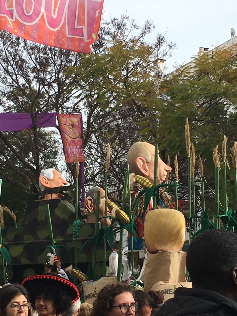 Karnevaalialueelle oli kuitenkin aikamoinen jono, joten eipä siinä auttanut kuin seistä ja odottaa. Siinä kohdassa onneksi aurinko antoi muutaman säteen lämpöä. Kun pääsimme lähemmäksi porttia , Jouni huomasi, että olemme lippujonossa, sen ohi kulkee paljon lyhyempi jono, josta pääsee sisään, jos on jo ostanut lipun. Vaihdoimme siis jonoa ja ihan kohta olimme keskellä hulinaa, musiikkia, ihmispaljoutta, käsittämättömiä pukuja ja vaunurakennelmia, Niistä seuraavaksi muutama kuva.
