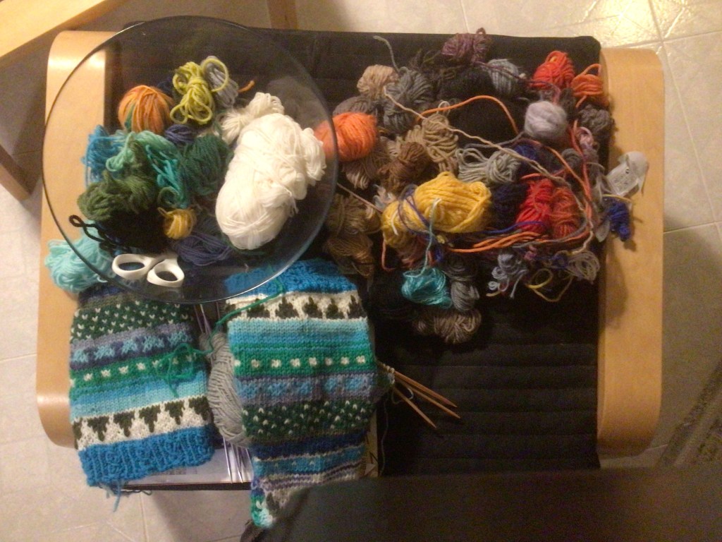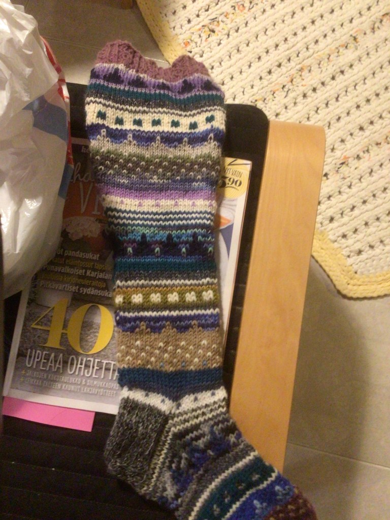 Ja sukkaa pukkaa…. Sain aikoinaan – siis viime keväänä – paljon pieniä langanjämiä eräältä ihanalta neulojalta, joka muuttti Suomeen. Jonkin aikaa kesti, ennenkuin aloin niitä työstämään. Nyt olen saanut neulottua niistä kolmet pitkät polvisukat, joissa värienpaljoutta riittää. Niin myös lankojen päättelemistä, joten siihen hommaan en ryhdy ennenkuin terassilla paistaa aurinko lämpimästi, ettei mene hermot.