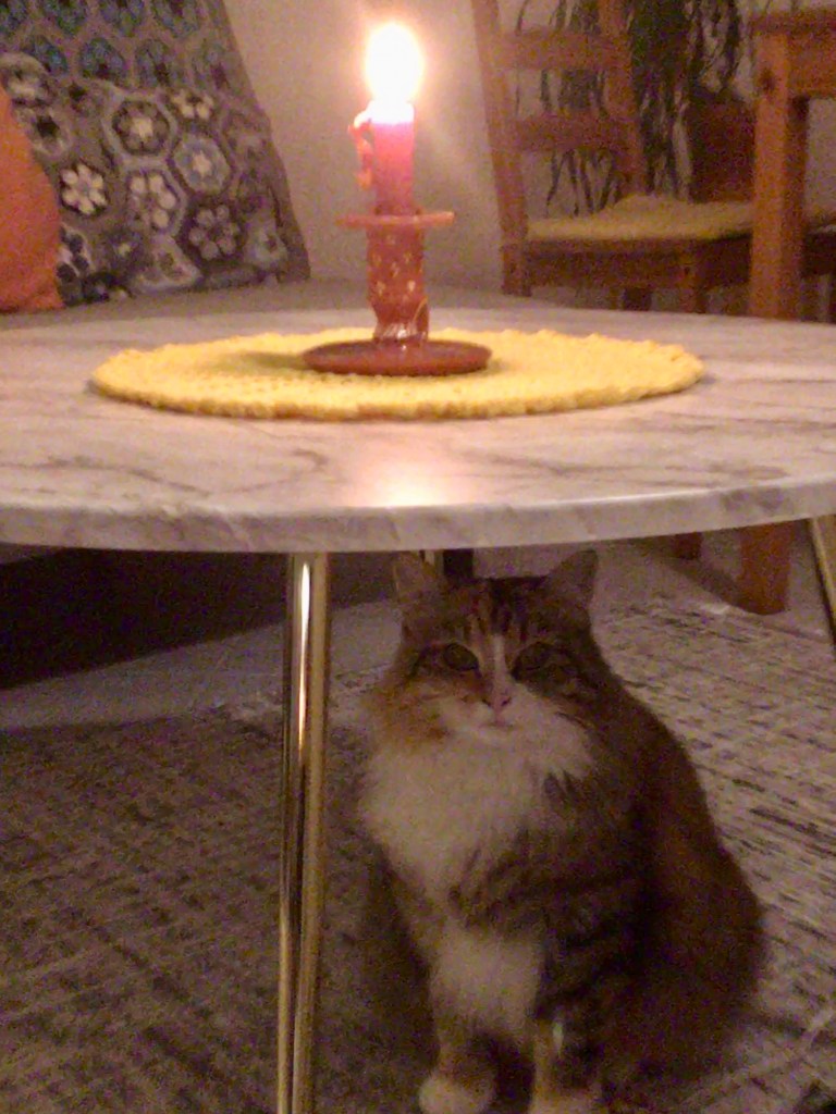 Hankimme samaan syssyyn myös olohuoneeseen pöydän, kun sellainen vielä puuttui. Se tuli perille kokonaisena, mutta kuvassa tietenkin kissa on pääosassa.