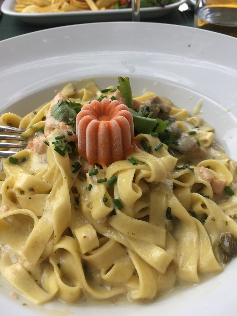 Lopuksi menimme syömään Lusitania-nimiseen ravintolaan Alvorin vanhaan kaupunkiin. Sekä päivä että ilta olivat aivan mahtavia ja taas tutustuin uusiin, mukaviin ihmisiin. Ruokakin oli hyvää, seuraavassa kuvassa on oma annokseni, lohipastaa sitruunakastikkeella ja pippurijäätelöllä – niin todellakin luki ruokalistassa. Ja se pippurijäätelö on tuo oranssi pikku kakku tuossa annoksen päällä, se mukavasti suli sinne pastan sekaan. Enpä ole ennen sellaista maistanut, mutta oikein hyvää oli!