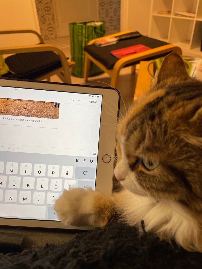 Koko ajan, kun olen tätä kirjoittanut, on kissa maannut sylissäni. Hän taisi hiukan kyllästyä, kun ei saanut riittävästi rapsutuksia tai silityksiä. Tai toinen vaihtoehto on, että hän vain haluaa osallistua minun tekemisiini.