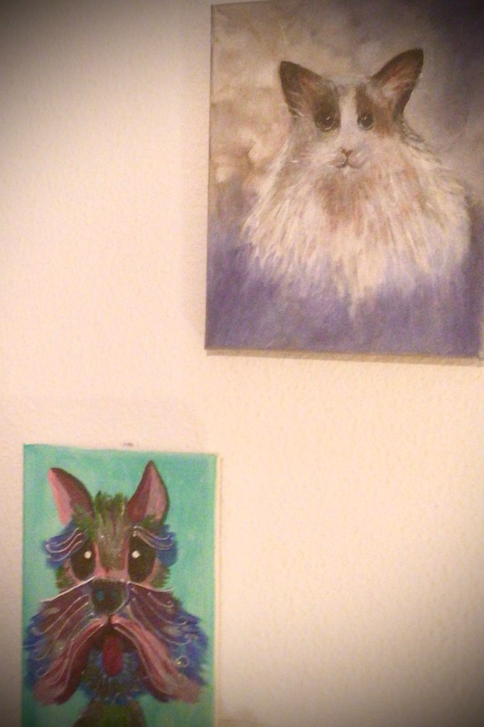 Myyjäisistä pääsi meille kotiinkin muutamia tauluja. Kissa ja koira ovat jo sulassa sovussa olkkarin seinällä, ja avaruusaiheinen maalaus vielä odottaa paikkaansa. Ja niinhän näissä tällaisissa inside-tapahtumissa aina käy, että kun asiakkaat ovat alkaneet harventua, alamme ostaa tavaroita toinen toisiltamme. Joko vaihtokaupalla tai rahalla. Meille ei tällä kertaa tullut kuin lihapiirakoita, sinappia, maksalaatikkoa, puolukkahilloa, kurkkusalaattia, valkosipulilevitettä, vähän villalankoja, kolme taulua ja yksi Gudrun Sjödenin mekko. 😂😂😂.. ai niin, ja Jouni vielä osti itselleen oikein hyvännäköisen ja edullisen kotiasun, verkkarihousut ja collegepaidan.