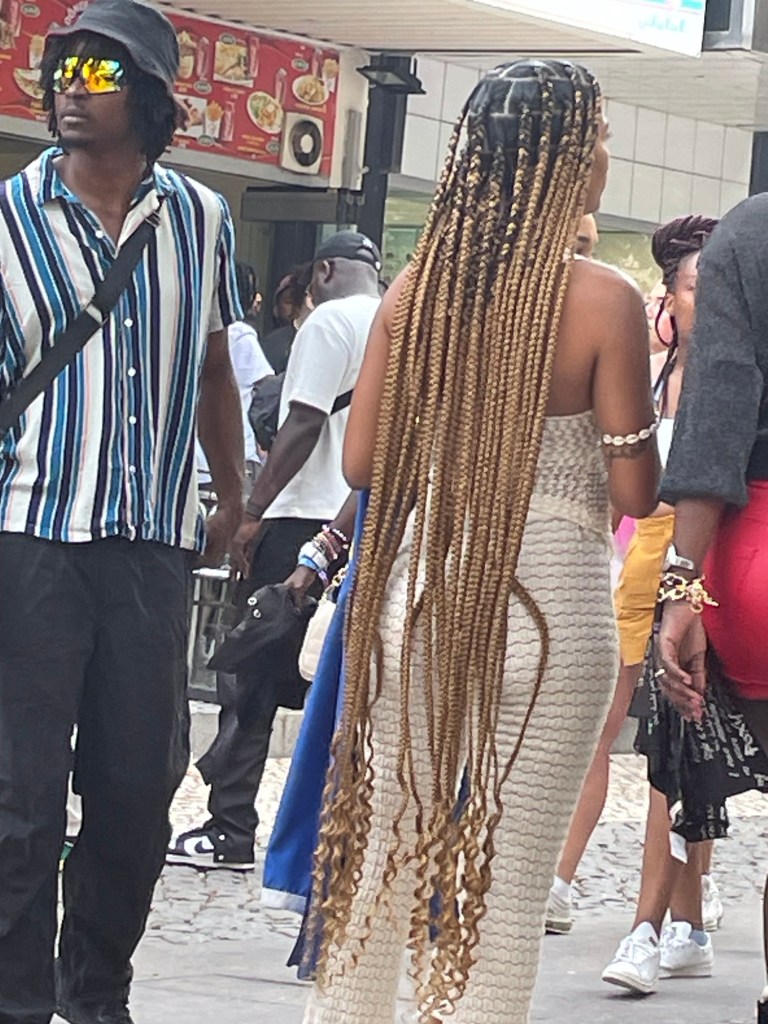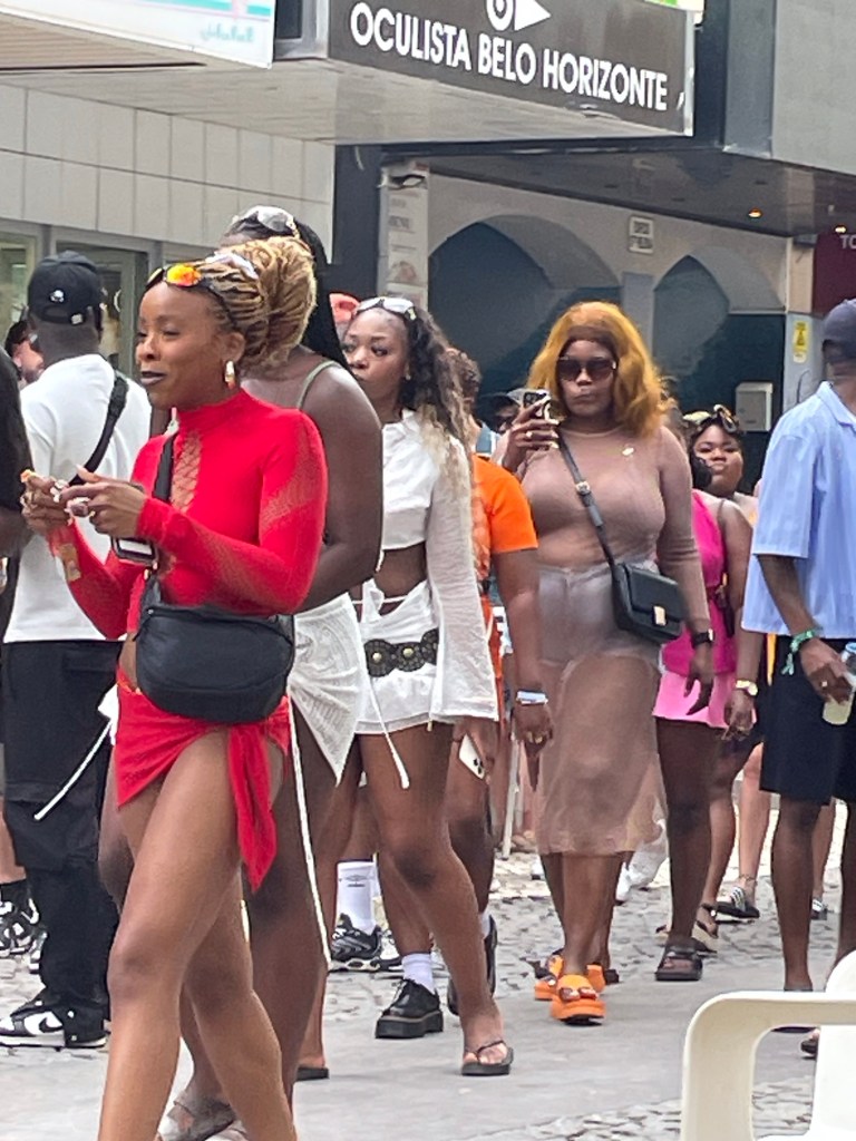 Kaupungilla näkyy hienoja lettikampauksia ja rastoja, upeita vaatteita ja niin kauniita tummia ihmisiä. Mutta kaupunkikuva ei ole mitään verrattuna Praia da Rochalla liikkuvaan porukkaan, joka on menossa illan konserttiin. Sinne oikein laittaudutaan ja tullaan ylpeänä positiivisella mielellä näyttäytymään. Ihmiset ovat iloisia, järjestyshäiriöitä en nähnyt, ja asut sekä keikalle valmistautuminen ovat olleet huolellista työtä.