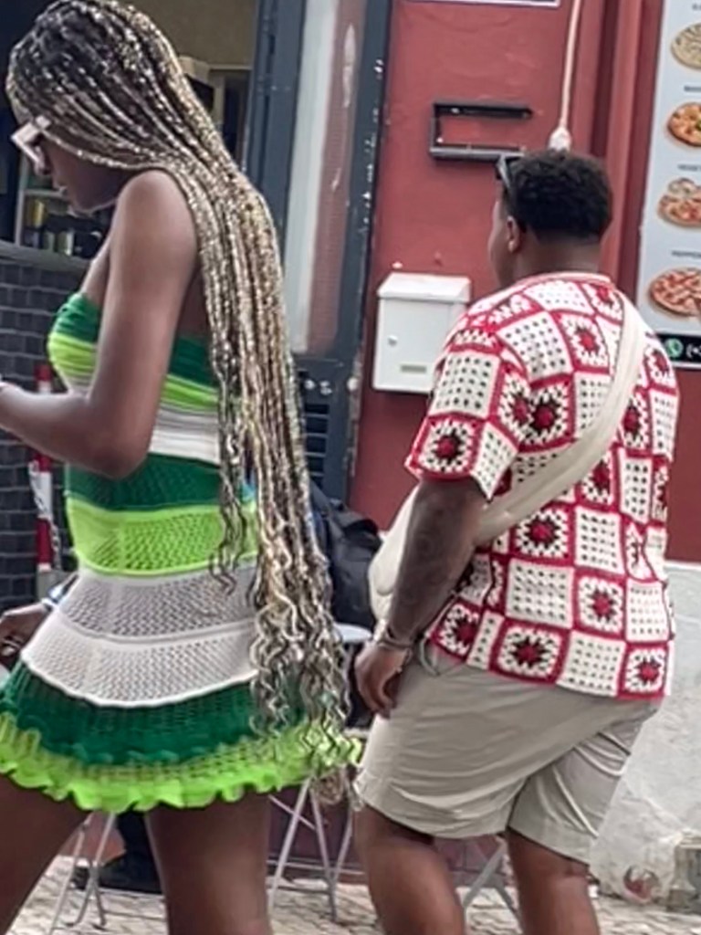 Mutta meille riitti niiden kauniiden ja värikkäiden nuorten ihmisten katselu. Kiinnitimme huomiota, kun varsinkin miehillä oli aivan tavallisista isoäidin neliöistä virkattuja takkeja. Naisilla oli enemmän samalla tekniikalla tehtyjä pikkuisia hameita. Käsityö kunniaan, jee!