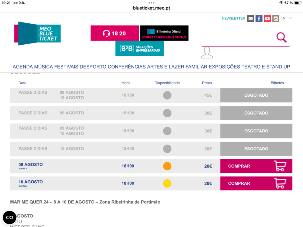 Joen rannalla on nyt sardiinijuhlien jälkeen kolmipäiväiset musiikkifestarit. Ne ovat maksullista koko illan konsertteja ja pääesiintyjä aloittaa iltakymmenen maissa. Portit kuitenkin avataan jo klo 18. Katselin lipputilannetta netistä ja näytti siltä, että vain kahteen viimeisen iltaan on enää saatavilla lippuja, eikä paljoa ole jäljellä niitäkään.