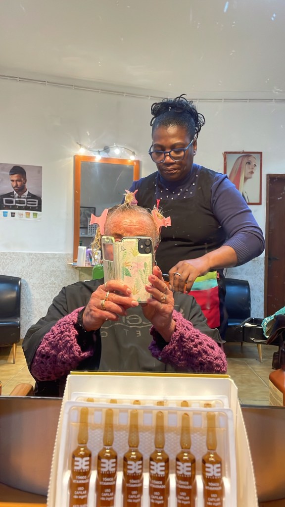 Olen vihdoin saanut leikkautettua niskassa hikoilevat hiushapsut pois. Tästä alkaa hiukan tasaisempi hiusten kasvatus. Ja edelleen luottokampaajani Eva on suosikkini. Olen käynyt siellä niin kauan, että hän osaa jopa tämän suomalaisen hapsutukkani käsittelyn, vaikka onkin Cap Verdeltä.