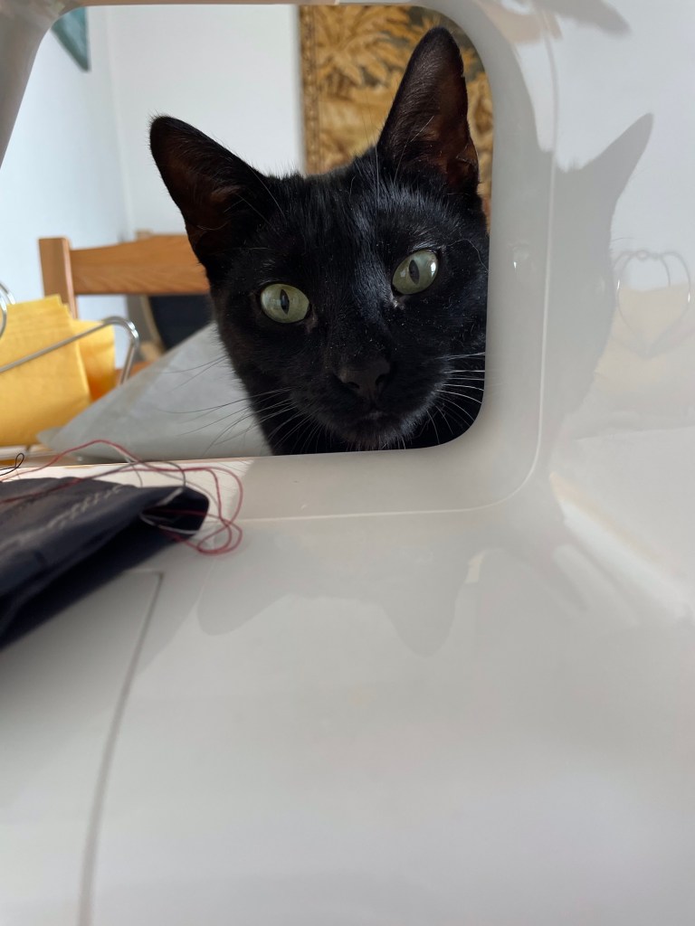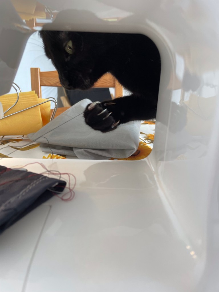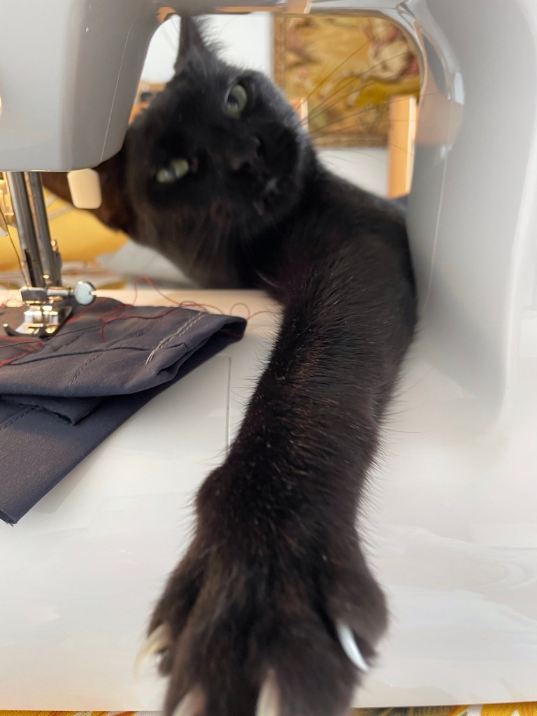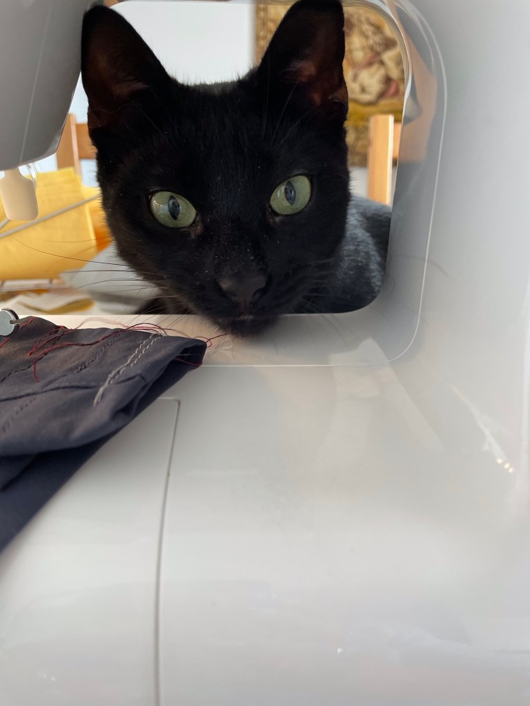 En ole pitkiin aikoihin ommellut mitään. Tänään tajusin, että en kertaakaan Hanneksen meillä olon aikana. Piti vain korjata Jounin paidasta pari revennyttä taskun reunaa, mutta siitähän tulikin aika show. Hannes yritti ottaa langanpätkistä kiinni, oli järjettömän utelias, kun näki liikkuvia osia, sekä hyökkäili jopa minun käsieni kimppuun, kun yritin hillitä hänen uteliaisuuttaan. Lopulta hän meni päiväunilleen ja sain homman tehtyä.