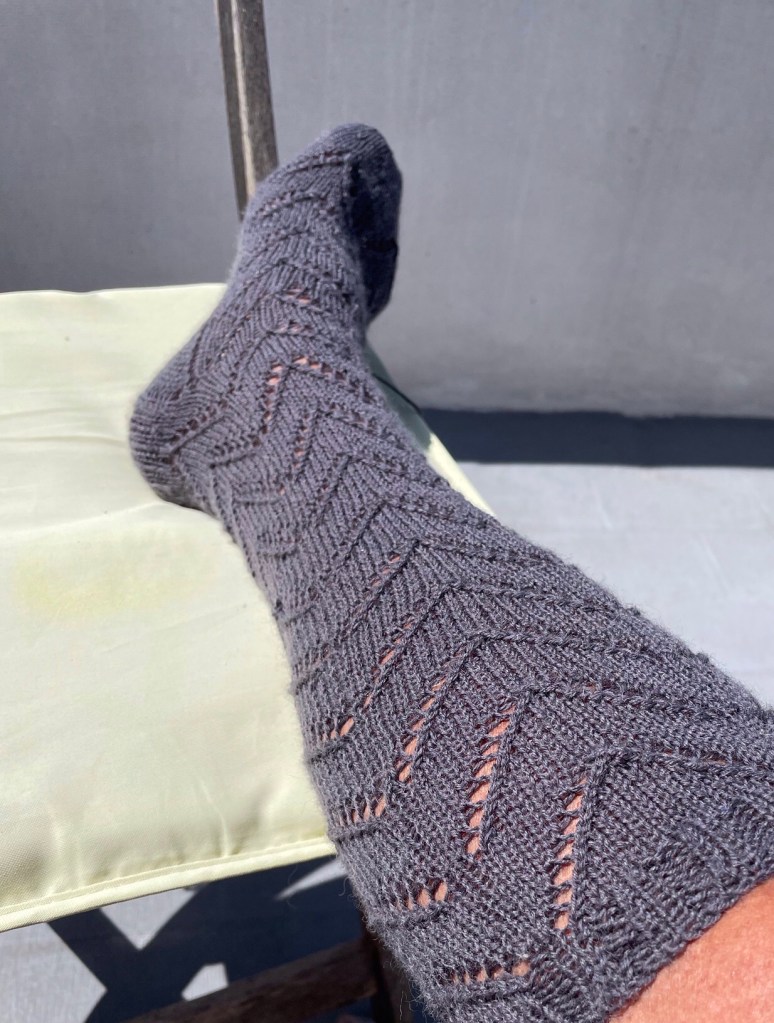 Mutta käsityötä minulla silti riittää, mikä on ihanaa. Olen saanut tilauksen polvipituisista superohuesta villalangasta neulotuista pitsineulesukista. Nyt täytyy pitää kiirettä, että saan toisenkin sukan valmiiksi ennenkuin tilaaja matkustaa Suomeen.