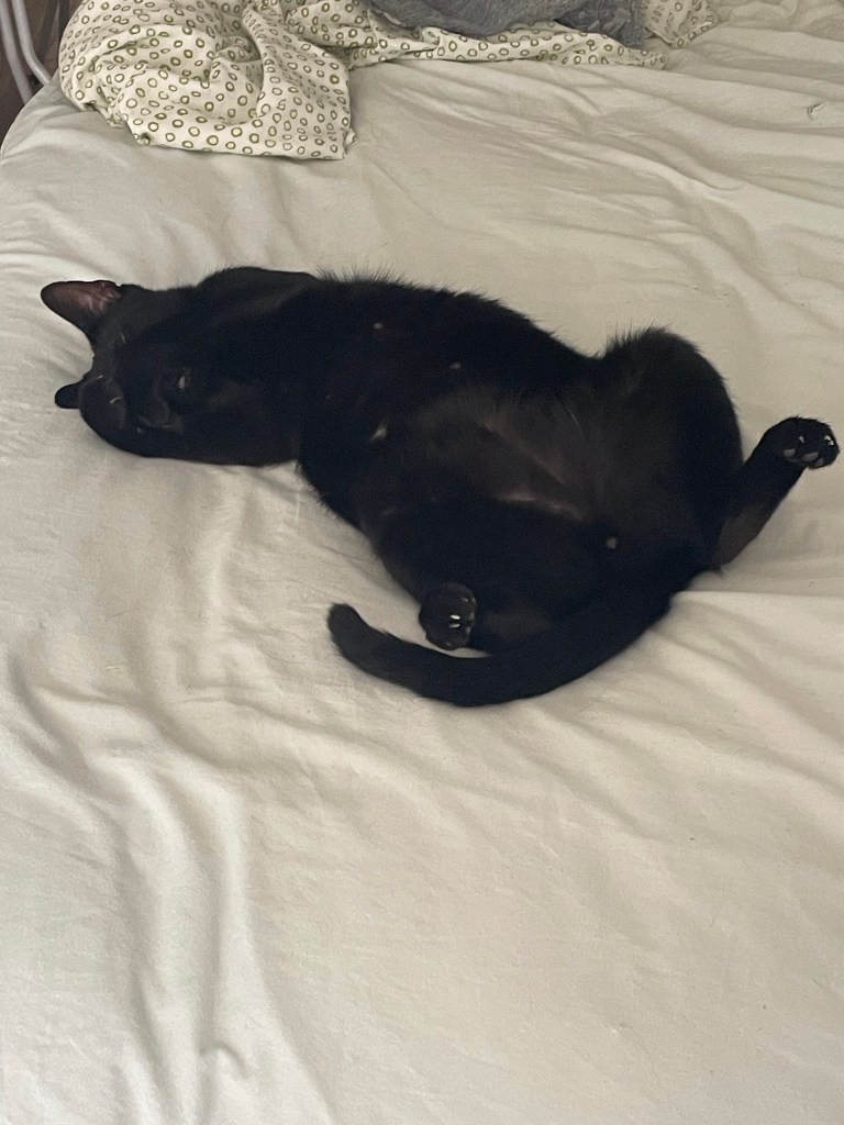 … mutta Hannes ottaa rennosti päiväsaikaan. Hänenhän piti olla Jounin kissa, ja hyvin hän on sisäistänyt sen, että kun aamulla öisen riehumisen jälkeen on nälkä, niin tassulla – ilman kynsiä – herätetään Jouni, ei minua, jee!