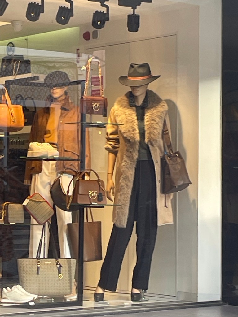 Lämmöt ovat lähellä kolmeakymmentä päiväsaikaan ja yölläkin lähellä kahtakymmentä, mutta näköjään jo varaudutaan tulevaan talveen. Vähän hassulta tuntuu olla hellemekossa ja katsella tuollaisia näyteikkunoita.